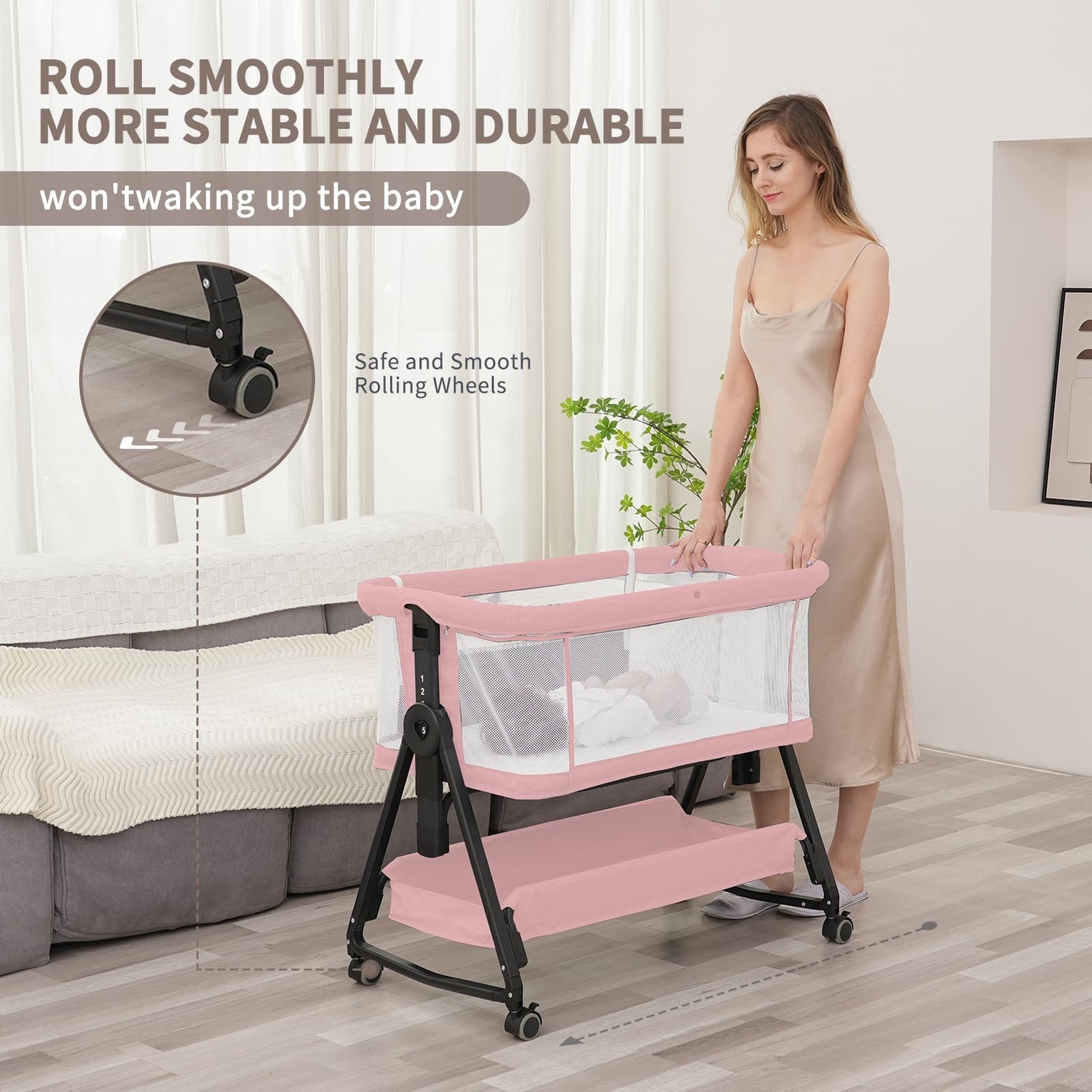 3 in 1 Baby Pink Bedside Bassinet Sleeper Height Adjustable