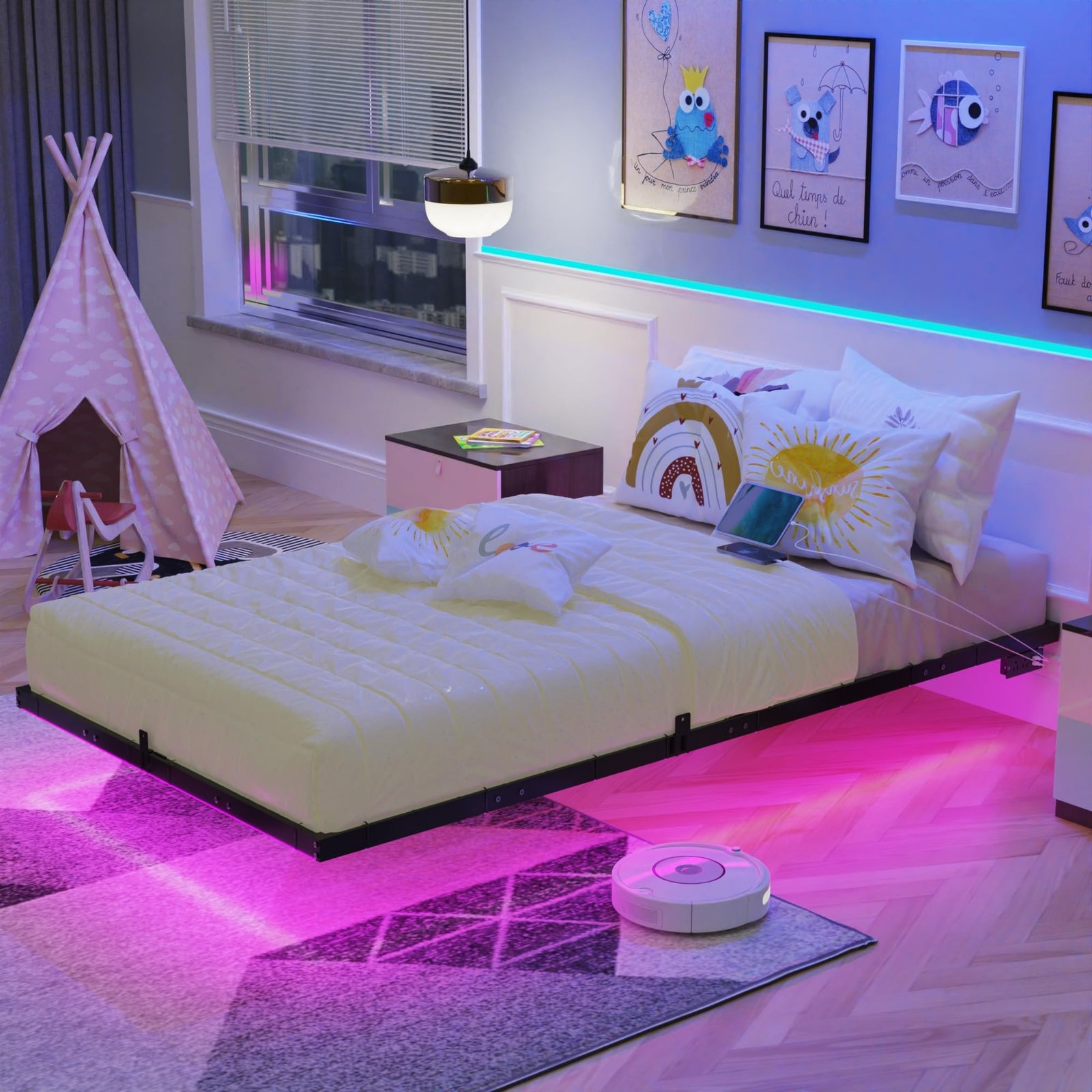SANGMUCEN Floating Twin Bed Frame with LED Lights & USB Charging Station