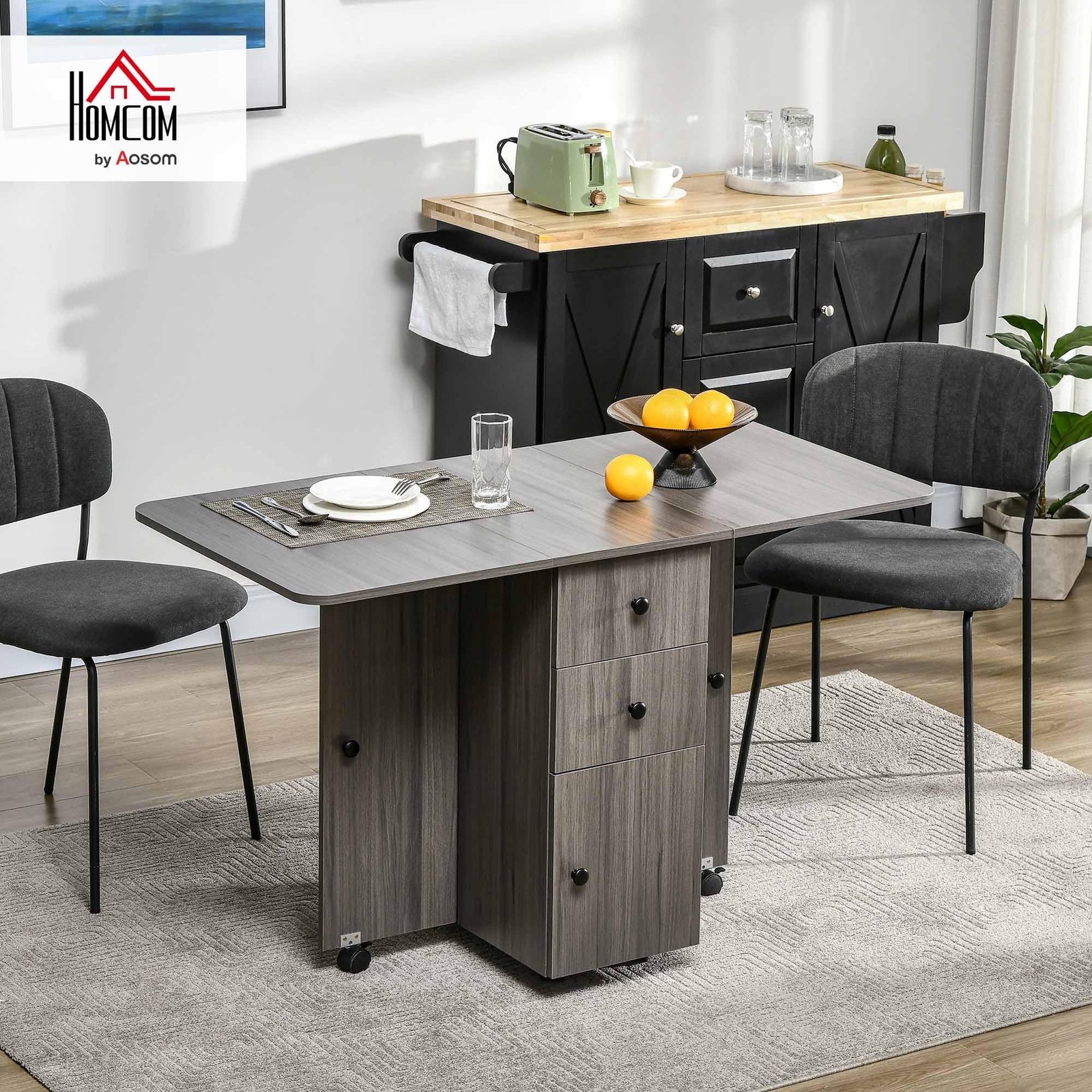 HOMCOM Foldable Dining Table, Rolling Kitchen Table with Storage