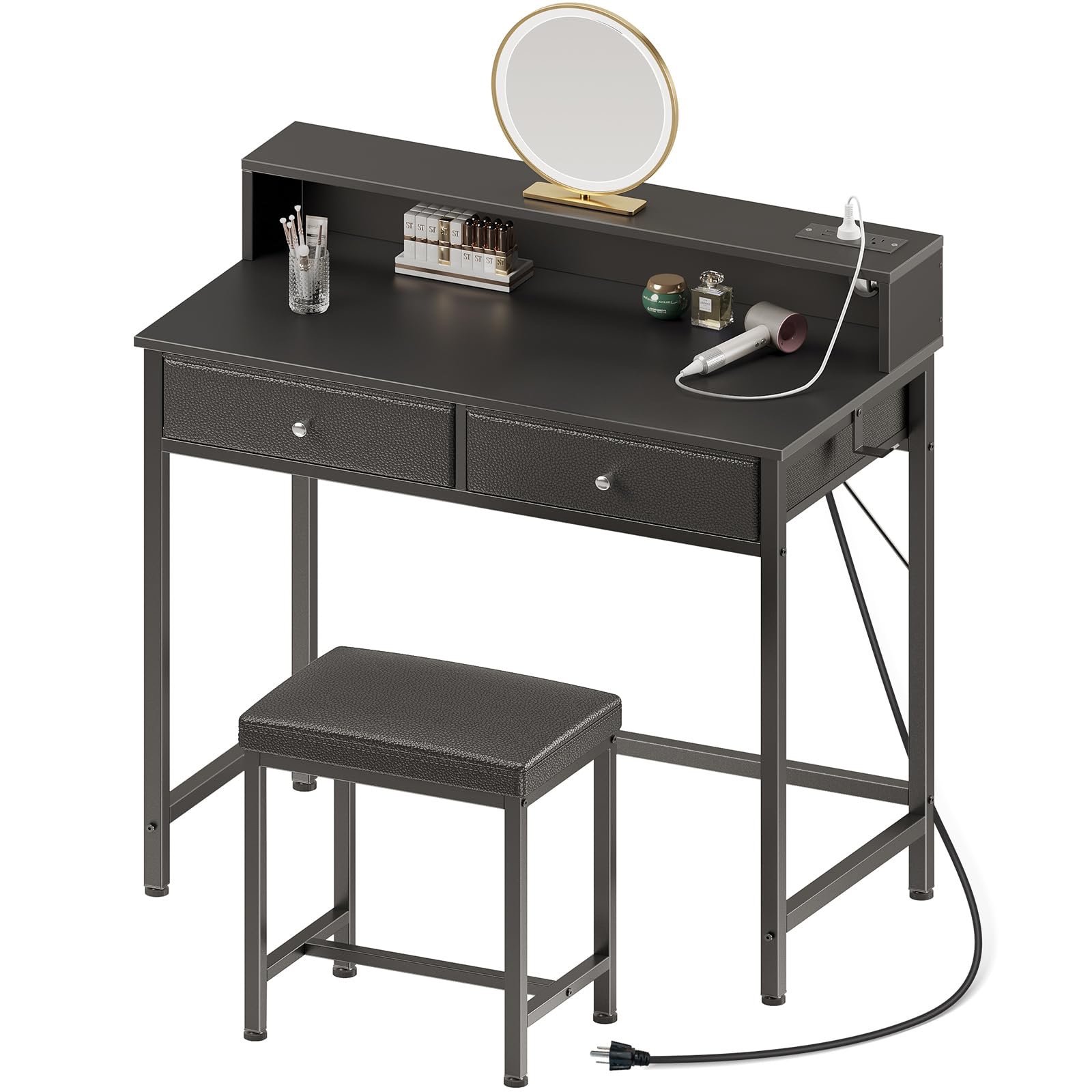 Seventable Vanity Desk with Stool, 2 Fabric Storage Drawers & Power Outlets