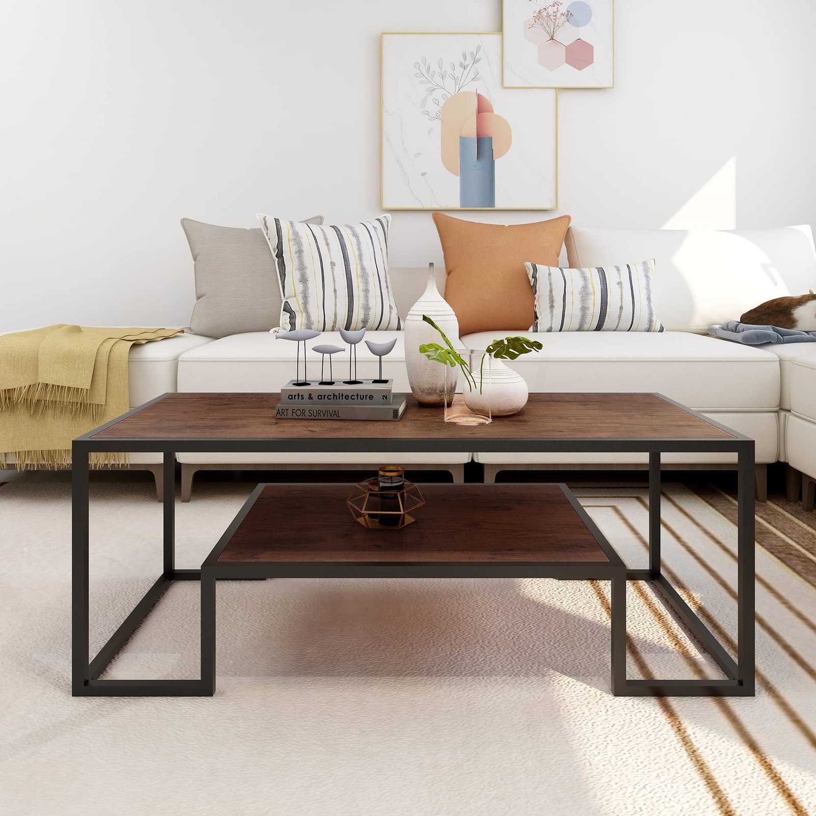 Modern Industrial Geometric Coffee Table with Shelves