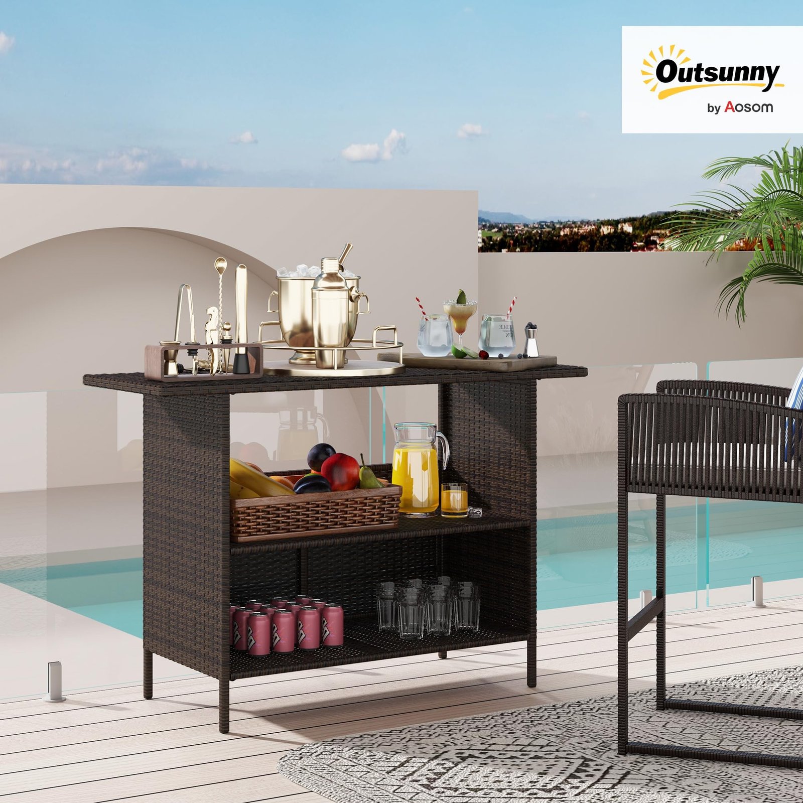 Outsunny Wicker Outdoor Bar Table with 2 Shelves