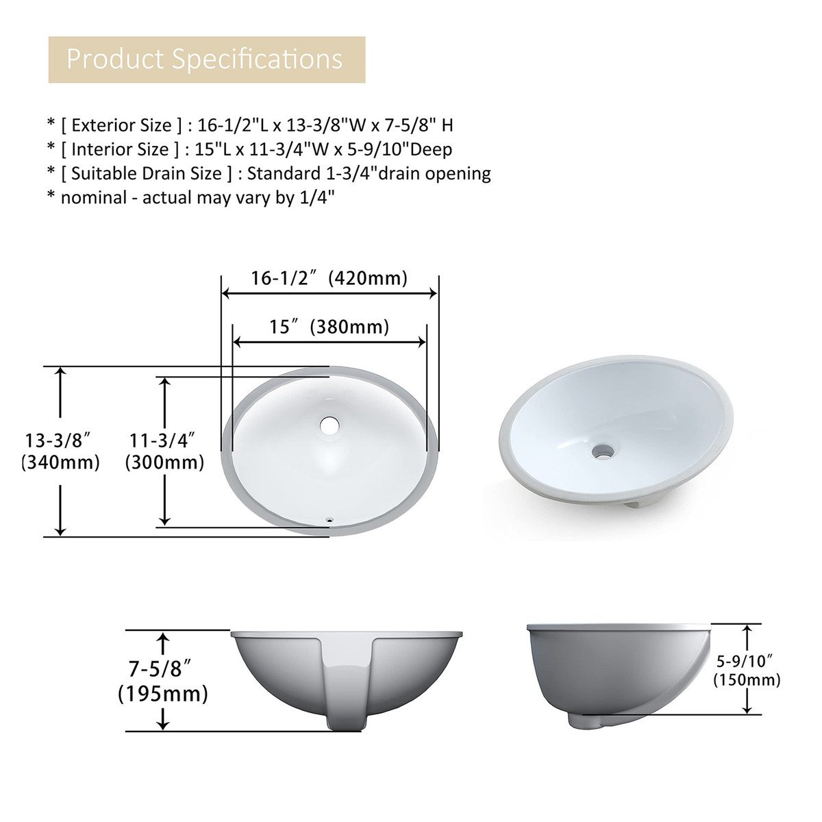 MEJE 16.5″x13″ Undermount Oval Bathroom Sink