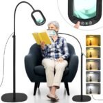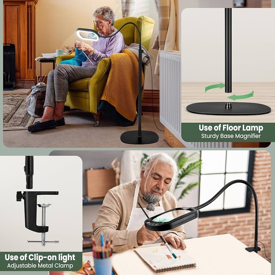 3 IN 1 Floor Lamp & Clamp Light: You can use it as a standing magnifying glass with light, the round rectangle weighted metal base that keeps the floor light more stable. The detachable metal pole allows for two different height floor lamps without needing tools, and it can also be used as a clamp desk lamp. The clamp can securely hold surfaces up to 2.1 inches thick on workbenches, tabletops, and in various settings such as homes, offices, studios, or workshops, allowing you to work comfortably.