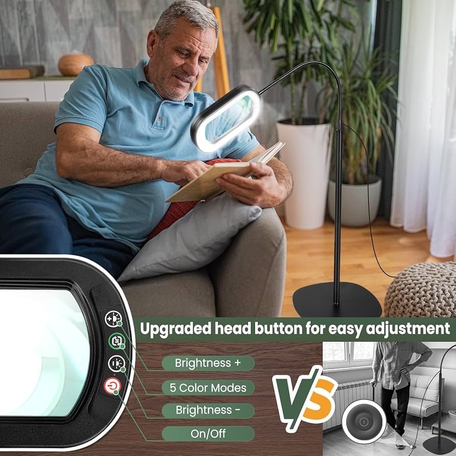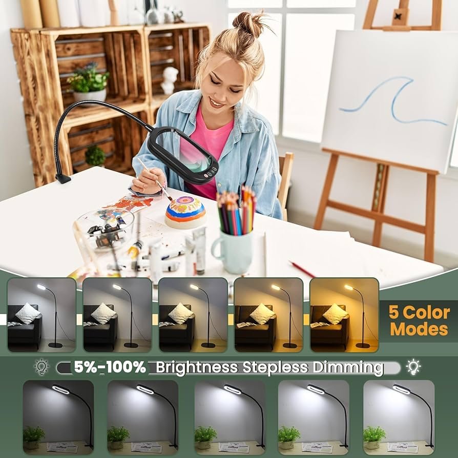5 Color Modes & Stepless Dimmable: Transform your workspace with our magnifier, designed to eliminate harsh glare and provide soothing illumination. Featuring 5 adjustable color modes and stepless dimming, you can easily find the perfect brightness for any task. Whether you need cool white for detailed work or warm light for comfortable reading. This flexibility reduces eye strain and enhances comfort during extended use, making it ideal for professionals, enthusiasts, and seniors.