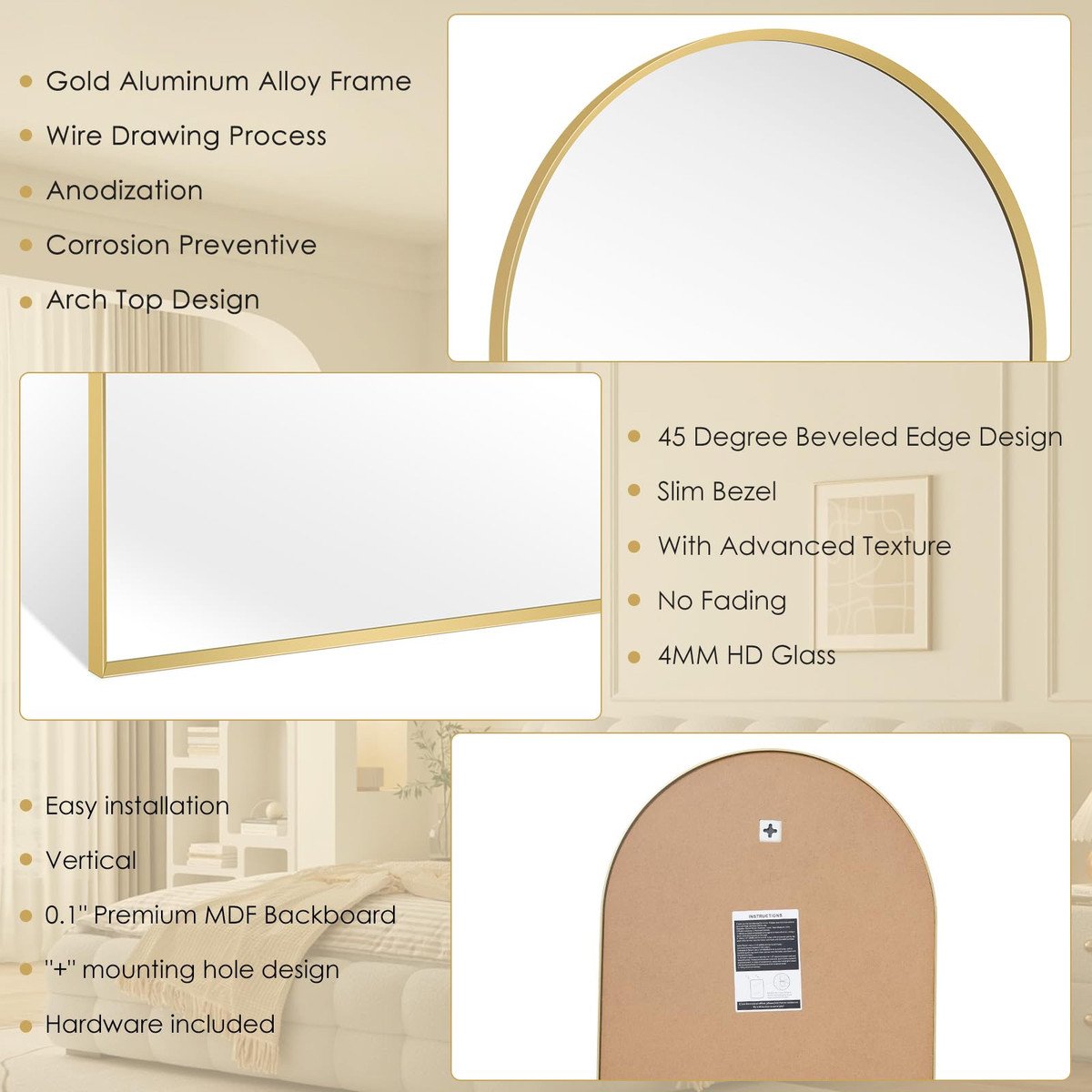 Brushed Gold Metal Frame: The gold arch mirror frame is made of aluminum alloy wire drawing technology, sturdy, durable, and rust resistant, designed specifically for long-term use. This wall mounted mirror can perform beautifully in both damp and dry environments.
