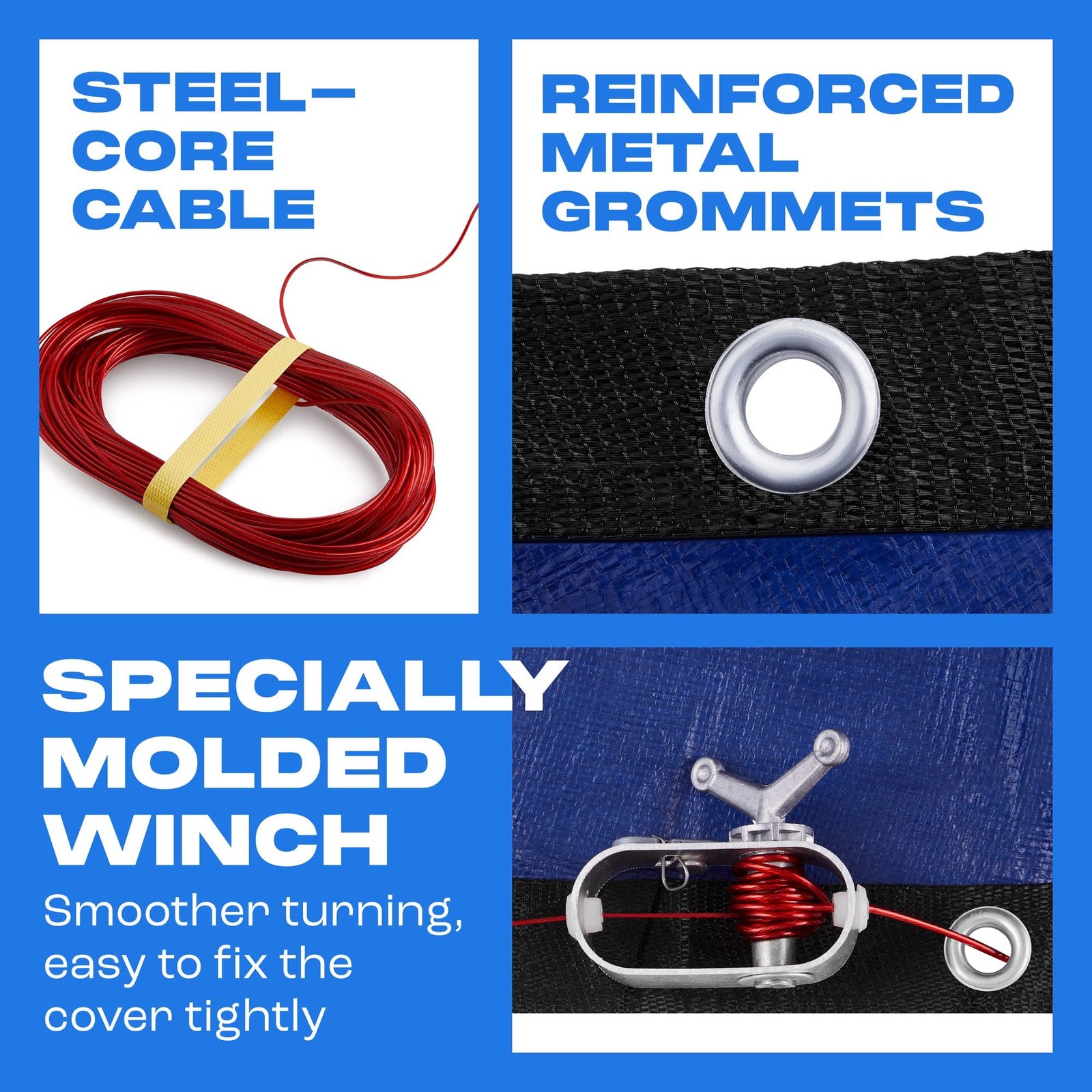 STRONG FASTENINGS FOR A STURDIER GRIP. To make sure that your pool winter cover won’t collapse, you need to fix it firmly in the first place. Swimming pool covers for above-ground pools that are tied up with a rope are often not up to the challenge. Instead, our pool cover kit has steel-core cable in it, and the cable goes into reinforced metal grommets, so you can consider your pool blanket neatly tucked. A specially molded winch turns smoothly and makes it easy to really tighten the cable.
