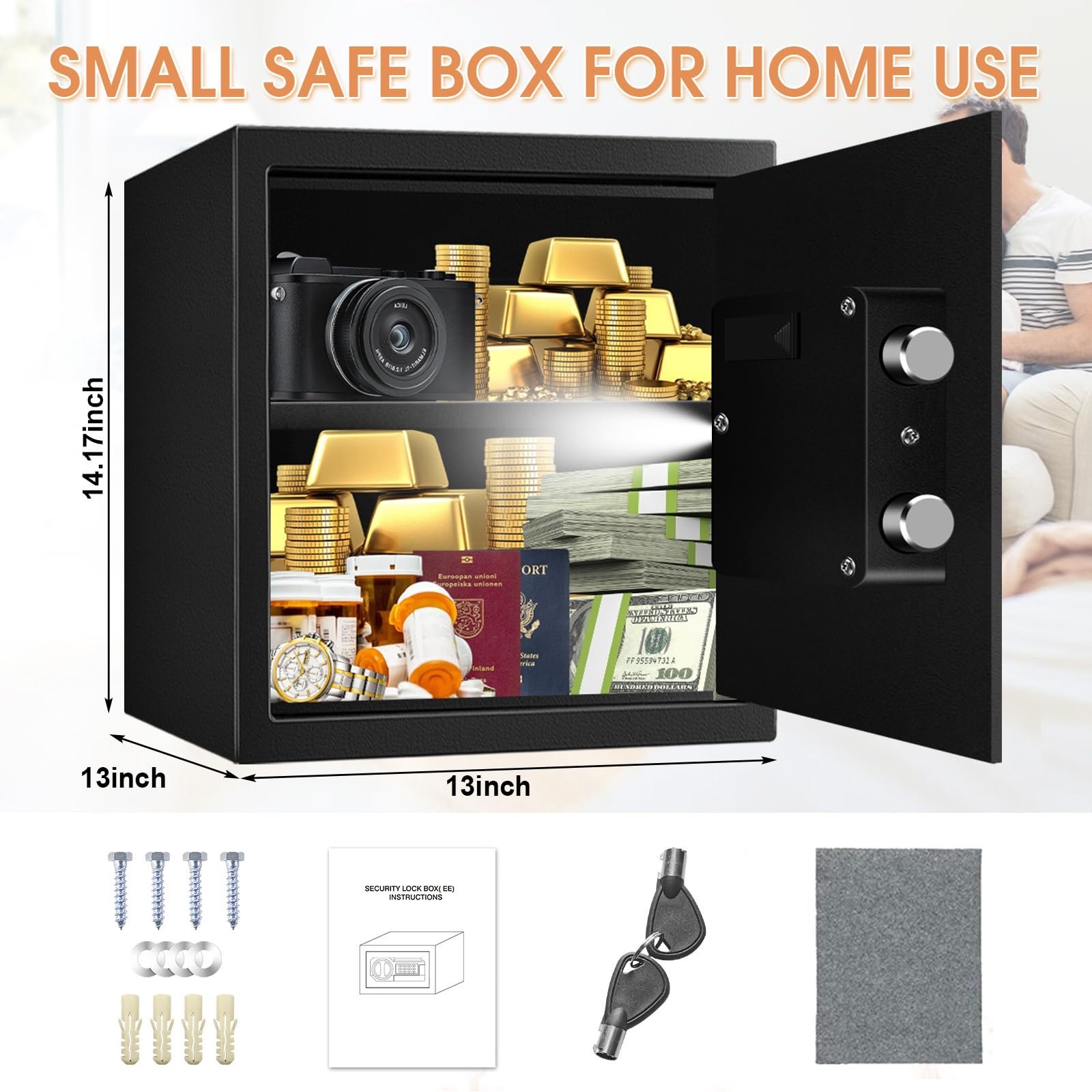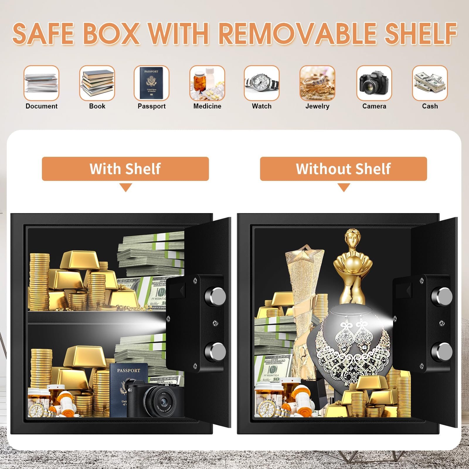 DIGITAL SAFE WITH REMOVABLE SHELF: Personal small home safe with a removable shelf can help you accommodate different sized things you want to store and organize your important items easily. You can take the shelf in or out according to your needs