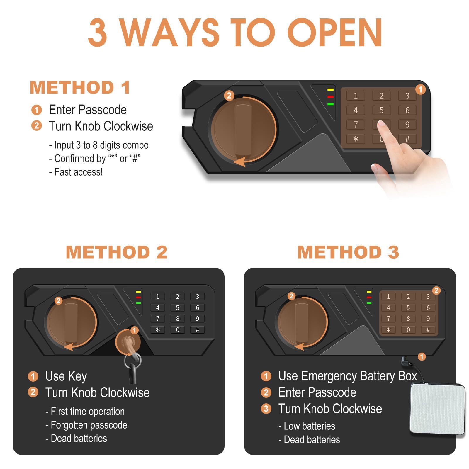 COMBINATION LOCK BOX: Designed with 3-8 digit PIN numbers and spare keys, you can set a 3-8 digit password for your home security safe. If you forget the password, you can open the safe with the hiding emergency key. There is a unique number on the keyhole, if your key is lost by accident you can contact us to get one