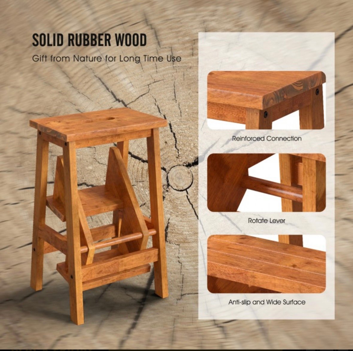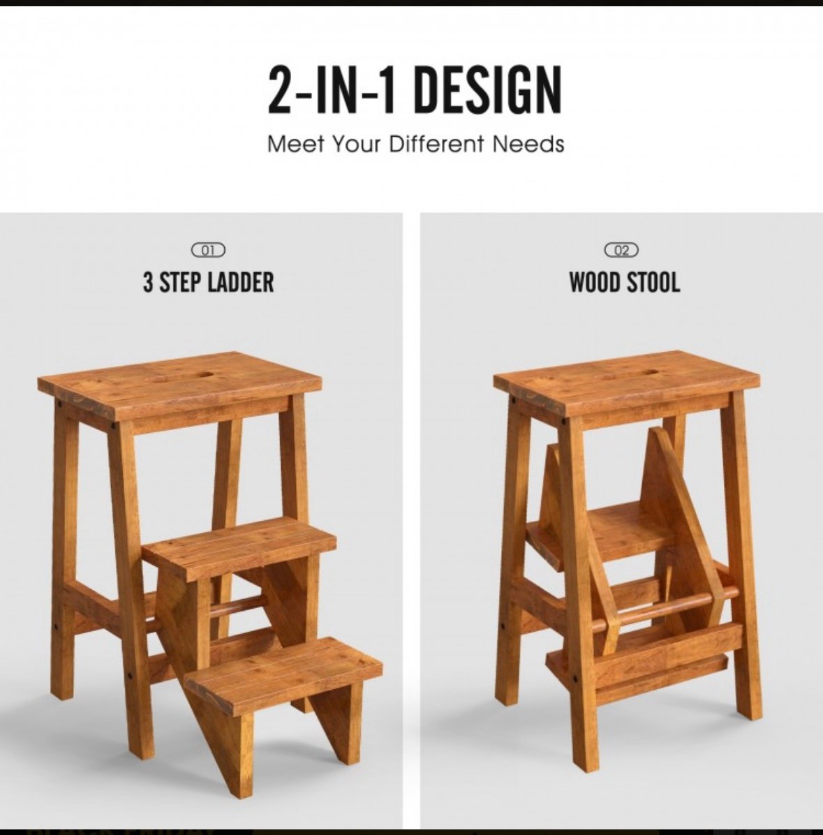 Constructed of solid rubber wood, this multifunctional step stool not only ensures its long service time, but also comes with a strong loading capacity of up to 200 lbs for each pedal. Besides, the surface is painted, which allows you to clean it with ease.