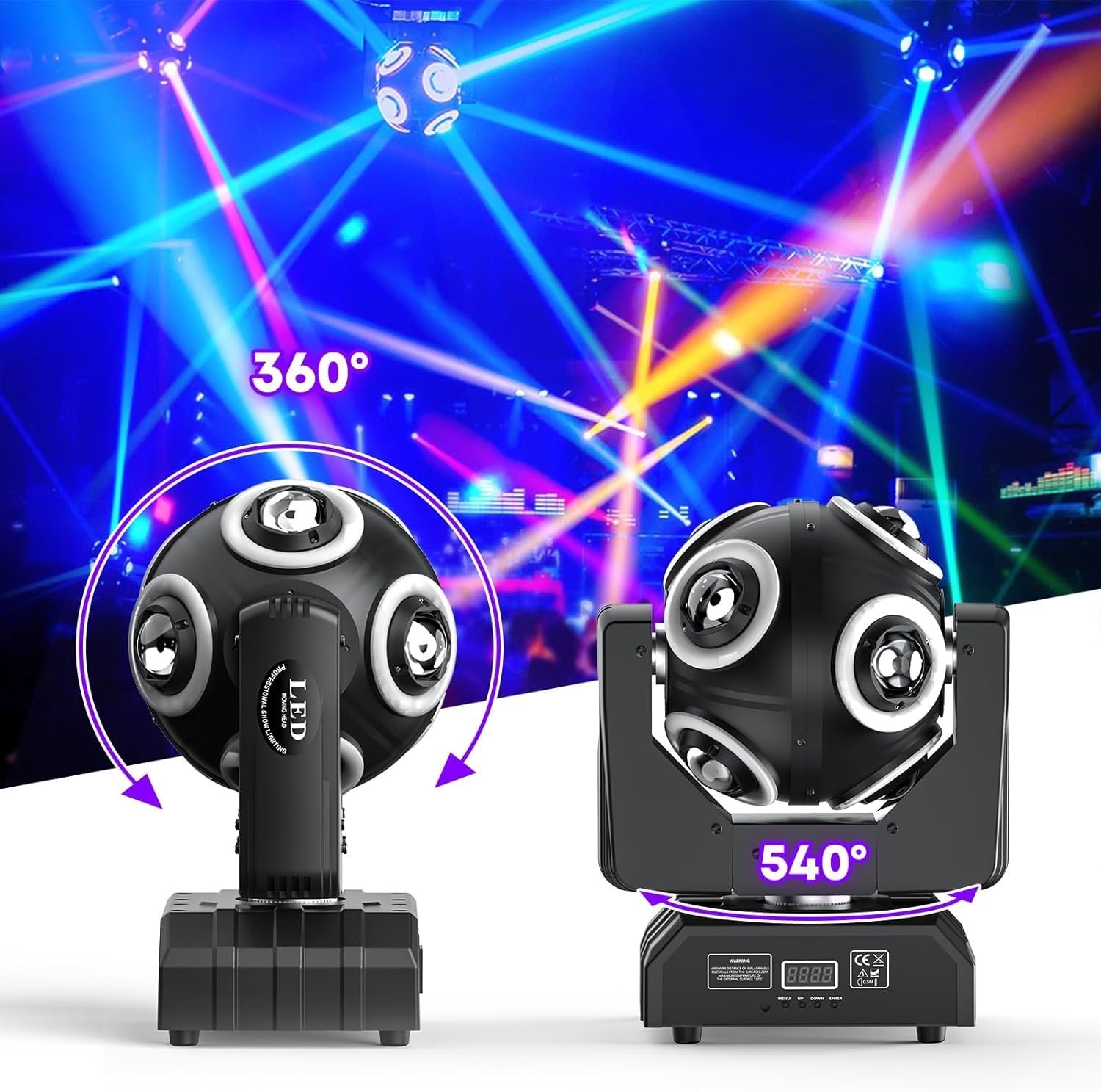 🎅【Precise Control and Rotation】With a remarkable rotation angle of 540° on the X-axis and 360° on the Y-axis, these DJ lights provide stunning beam movements that will captivate your audience. The self-propelled, voice-activated, master-slave, and DMX control modes allow for easy customization and synchronization with other lighting equipment.