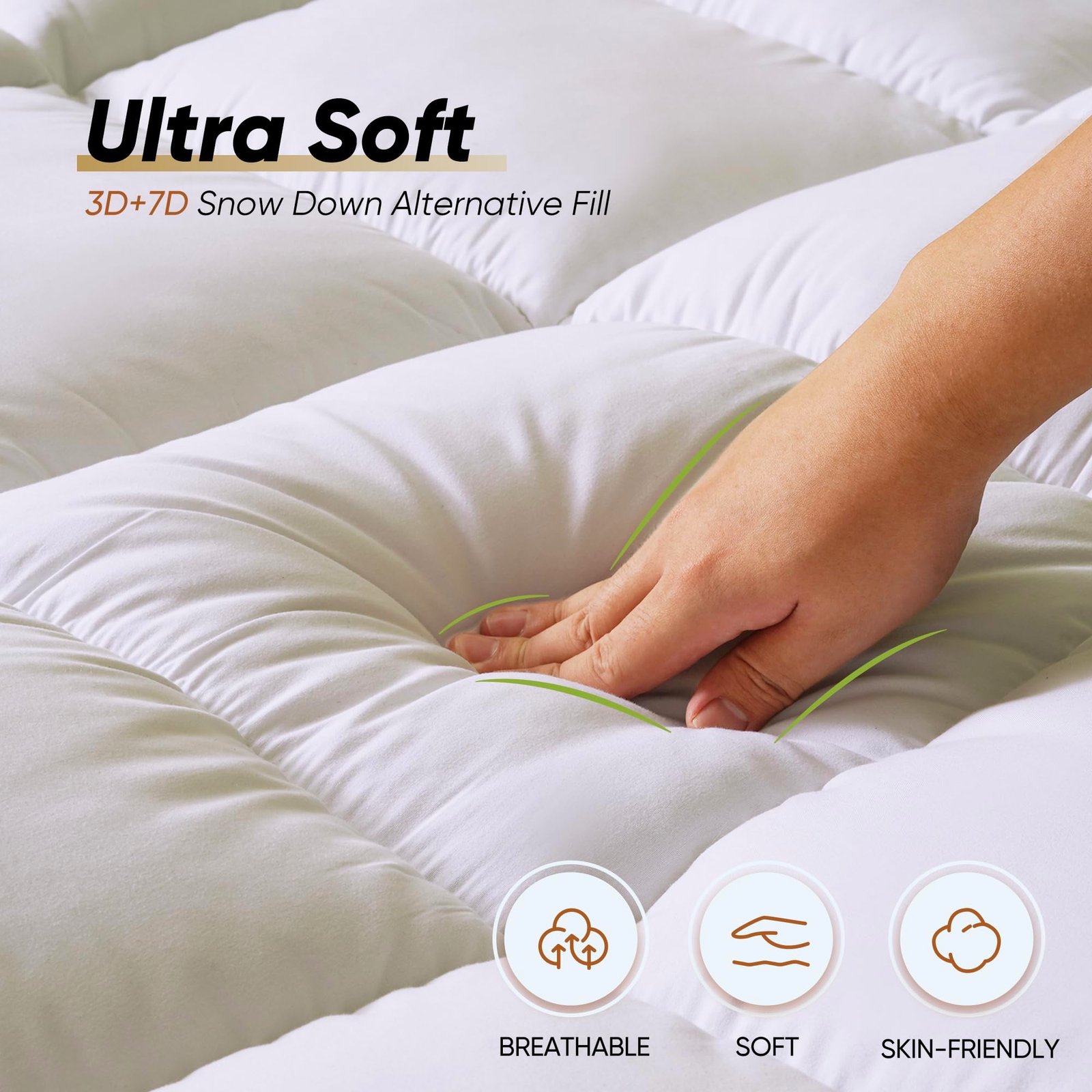 Deep pocket and Easy Maintenance: Boasting a dynamic 8″-21″ elastic deep pocket with a 360° all-around elastic skirt, the bed topper clings steadfastly to your mattress, ensuring a snug and secure fit no matter how much you move during the night. Plus, The pillow top can machine washable, featuring a gentle cycle with cold water and tumble dry on low for easy maintenance.