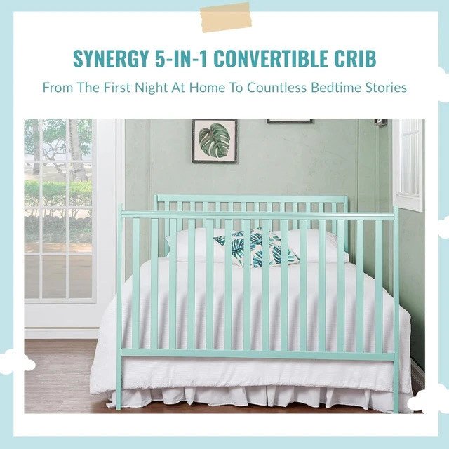 5-IN-1 CONVERTIBLE CRIB – A lifetime investment, the Synergy grows with your child, easily converting from a crib into a toddler, day and full-size bed; Toddler guardrail, stabilizer and full-size rail sold separately; Features 3 mattress height settings