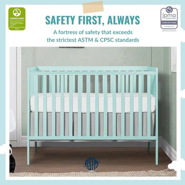 SAFETY FIRST ALWAYS – This crib is JPMA Certified to meet or exceed all safety standards set by the CPSC & ASTM; All of our products are tested by 3rd party labs for lead and other toxic elements to meet or exceed CPSC and ASTM safety standards