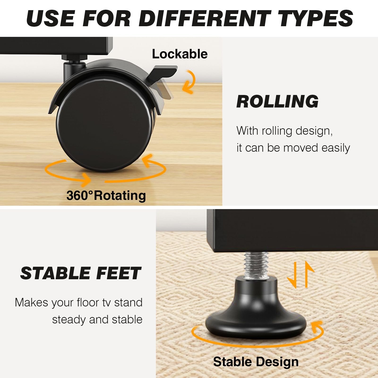 【Mobile TV Stand or Floor TV Stand: Free Choice to Move or Fix】: The mobile TV cart includes two types of feet. Flexible wheels move smoothly on the floor or carpet without scratching the floor and without noise. When you move the TV rolling cart around the house it doesn’t interfere with your family’s sleep. If you want to stabilize the TV cart, you can replace 4 adjustable height feet, which can keep the TV stands stable even if the carpet has a height difference.