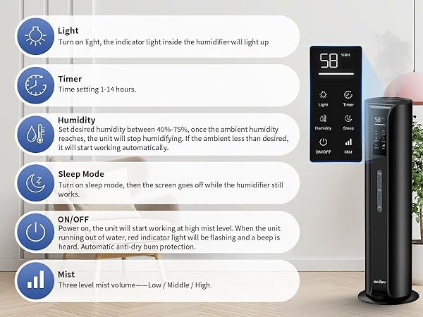 ?Sleep Mode & Water Shortage Protection?Cool mist humidifier operates below 38 decibels and when sleep mode is turned on, the light on the control panel will be turned off for undisturbed dreaming. If the set humidity is reached or there is no water, it will automatically shut off to prevent damage and ensure your safety.