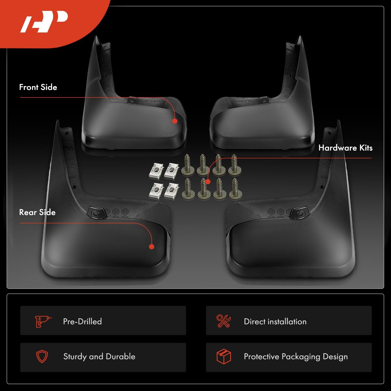 [Specifications]: ① Package Type: Box Packaging; ② Materials: PP+TPE; ③ Color: Black; ④ Injection Style: OE Replacement Molded; ⑤ Installation: Front & Rear – Pre-Drilled (Direct-Fit); ⑥ Quantity of One Set: 4