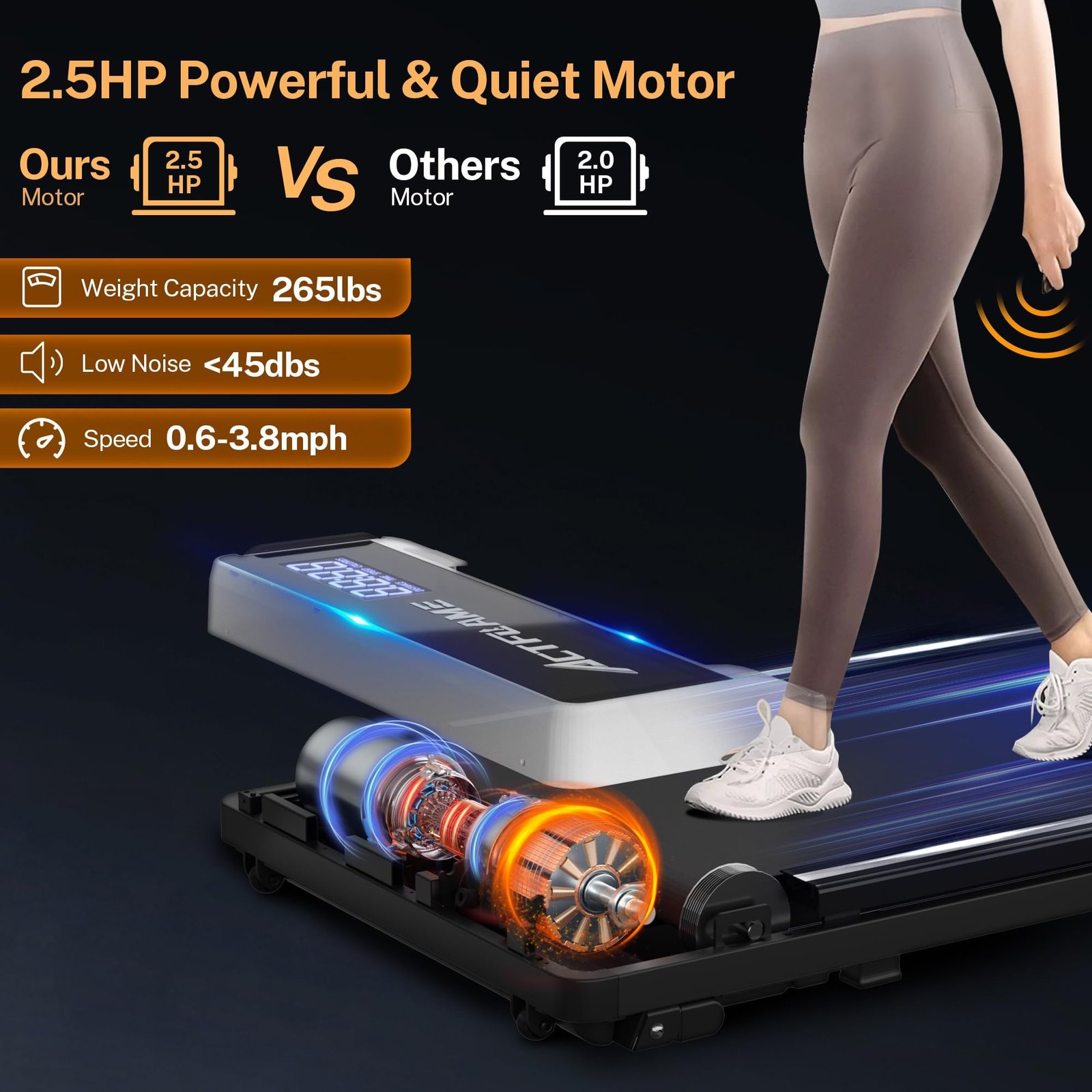 2.5HP Powerful Silent Motor: Walking treadmill is equipped with a 2.5HP motor that can support weights up to 265 pounds while keeping operating noise level lower than 45 db, making it ideal for home and office use without worrying about disturbing others. Enjoy a quiet and comfortable workout experience with an under desk treadmill.