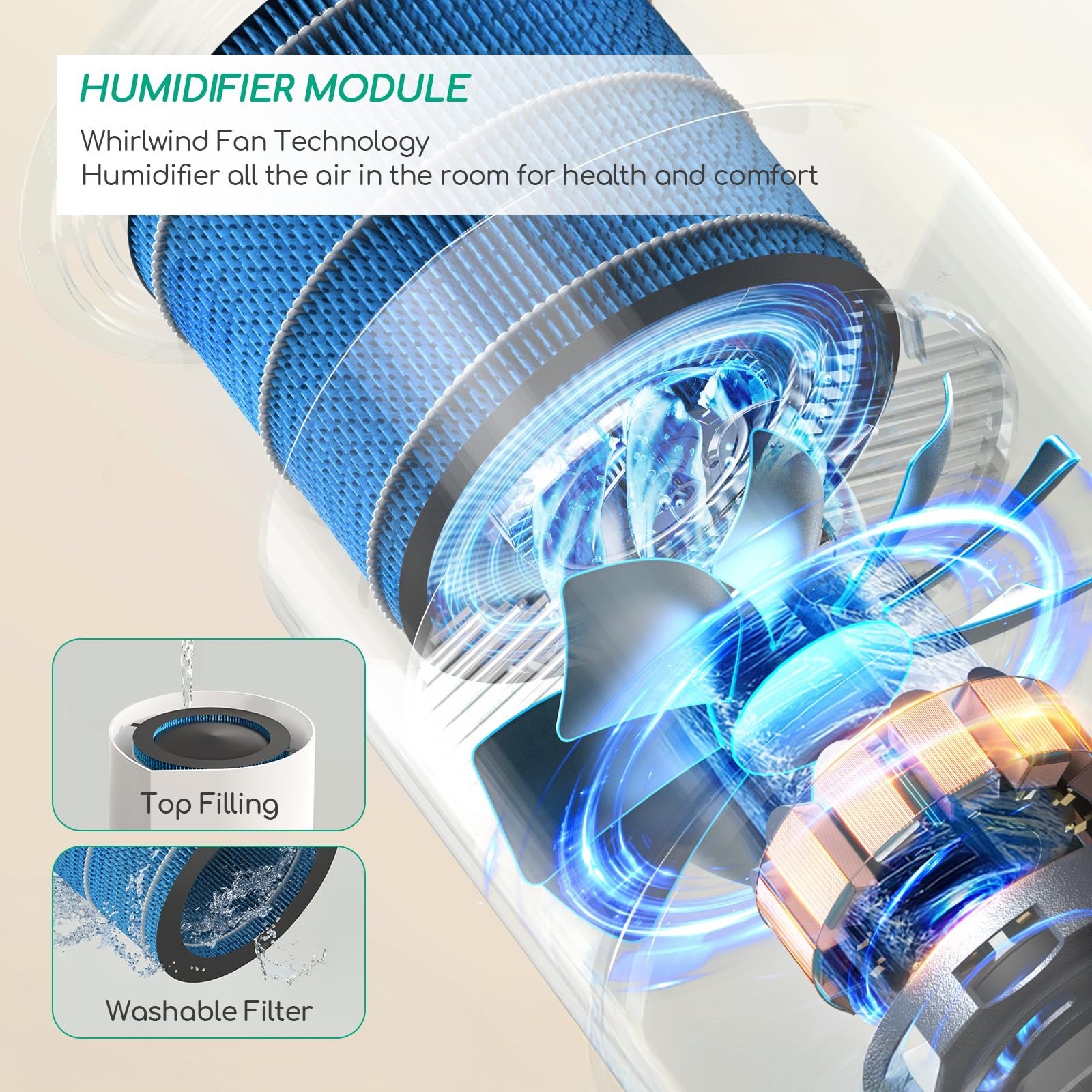 - 🌿【 Pure Evaporative Humidification】Utilizes evaporation to transform water into nano-sized molecules, adding moisture to the air without producing mist, thus avoiding impurities and dust accumulation. Promotes a healthier environment, alleviating coughs, allergies, dry skin, wrinkles, insomnia, and nosebleeds.