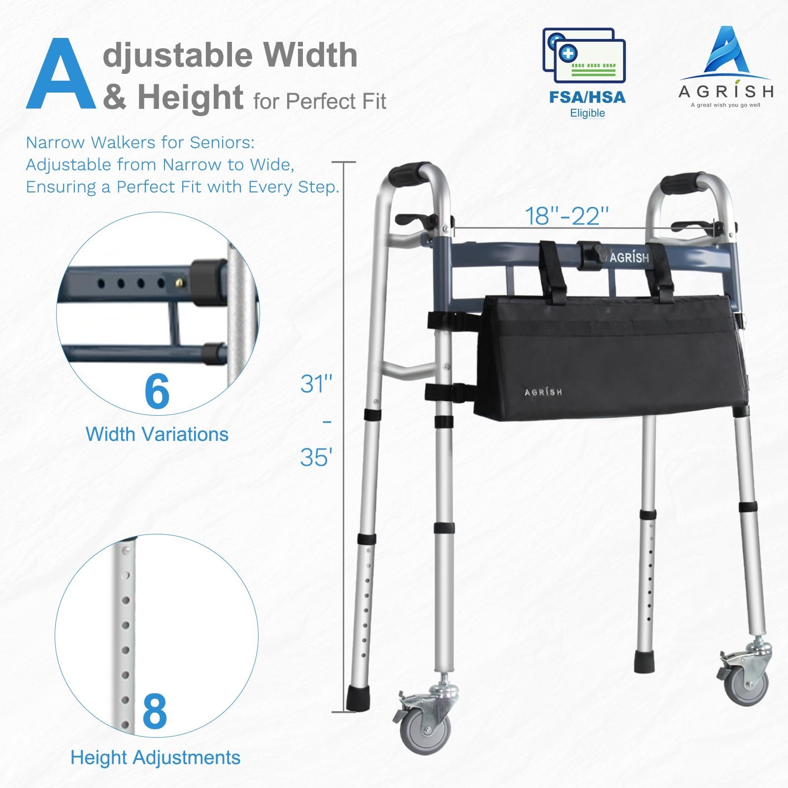 Width Adajustable Design: Agrish Narrow Walkers has 6 adjustable positions for seniors. Narrow Width from 18 inches to 22 inches. Easy to transfer in and out of vehicles. Idea for indoor and outdoor