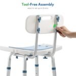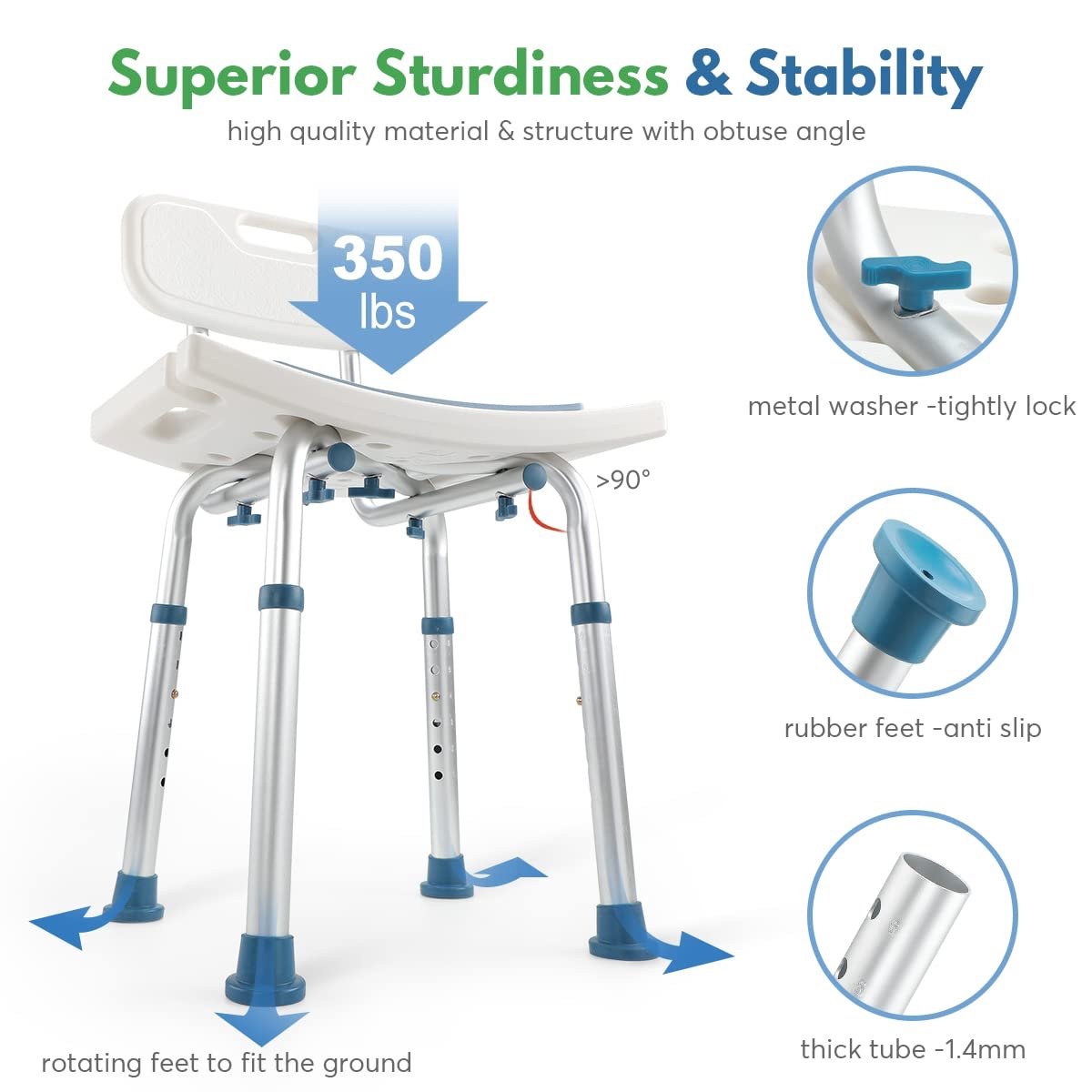 【Durable Tubes and Sturdy Structure】Tubes are thickened from 1.0mm to 1.4mm, so the shower chair supports up to 350lbs. With metal washers and obtuse frame, shower chairs are more sturdy. Anti-skid rubber feet make it a stable bathtub chair for shower.