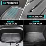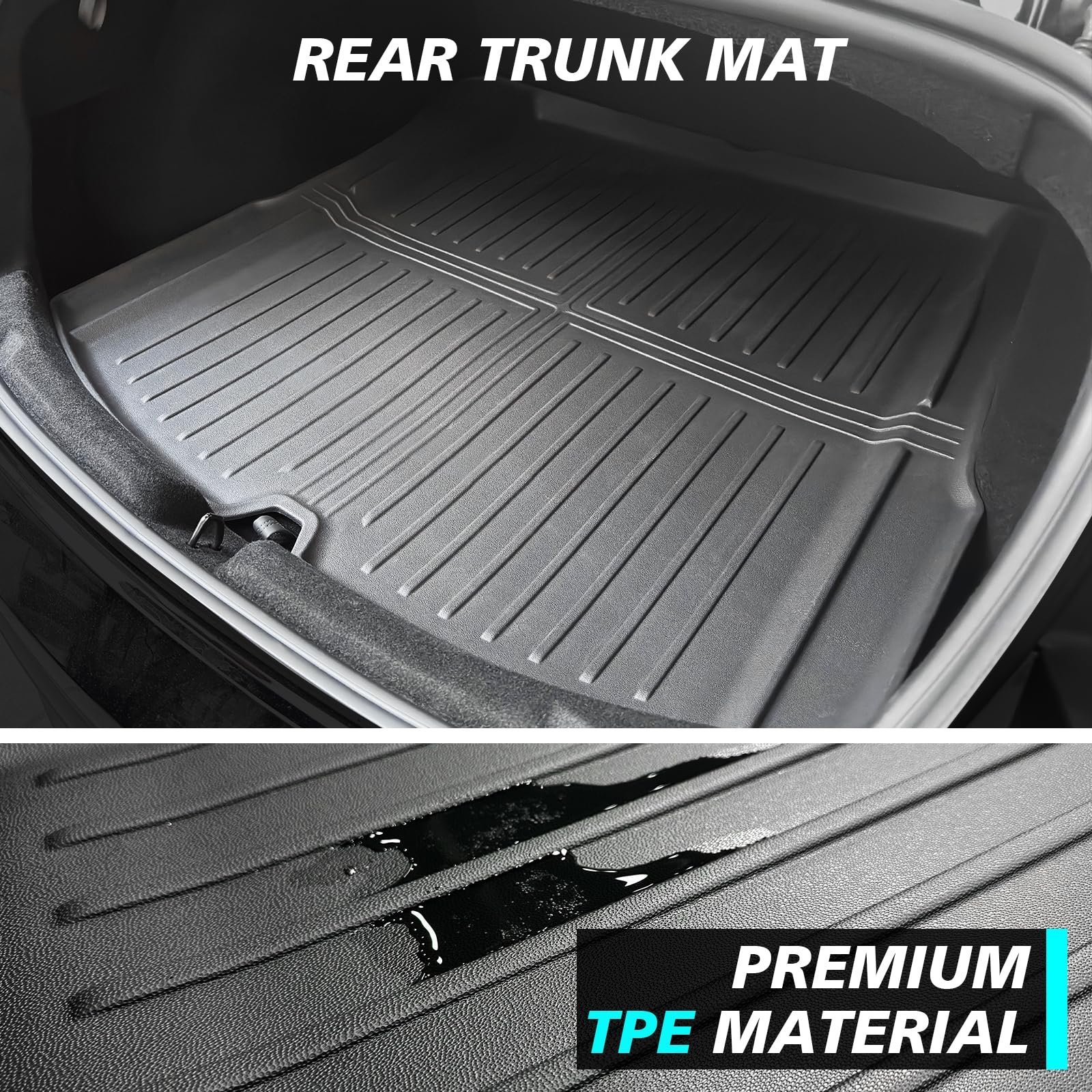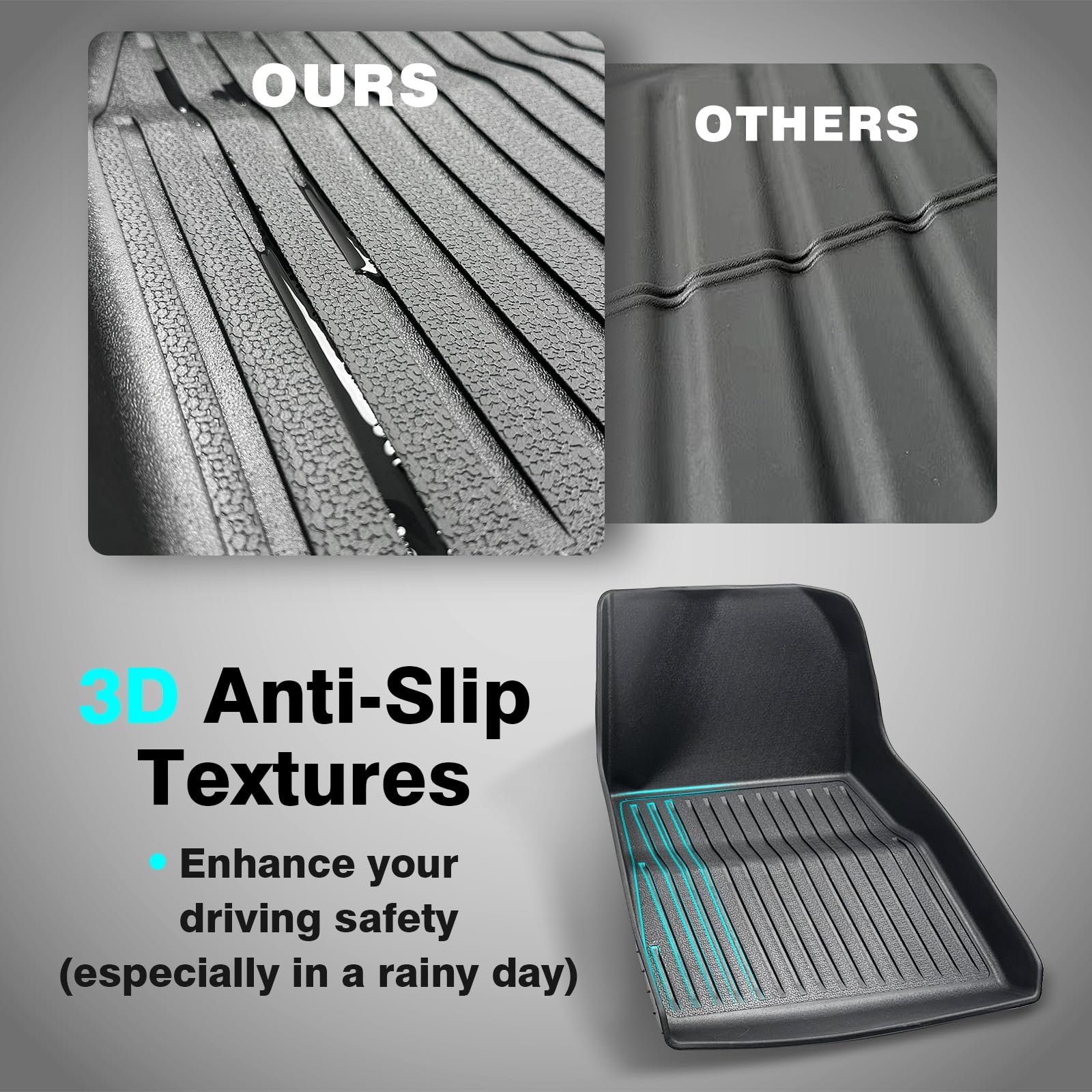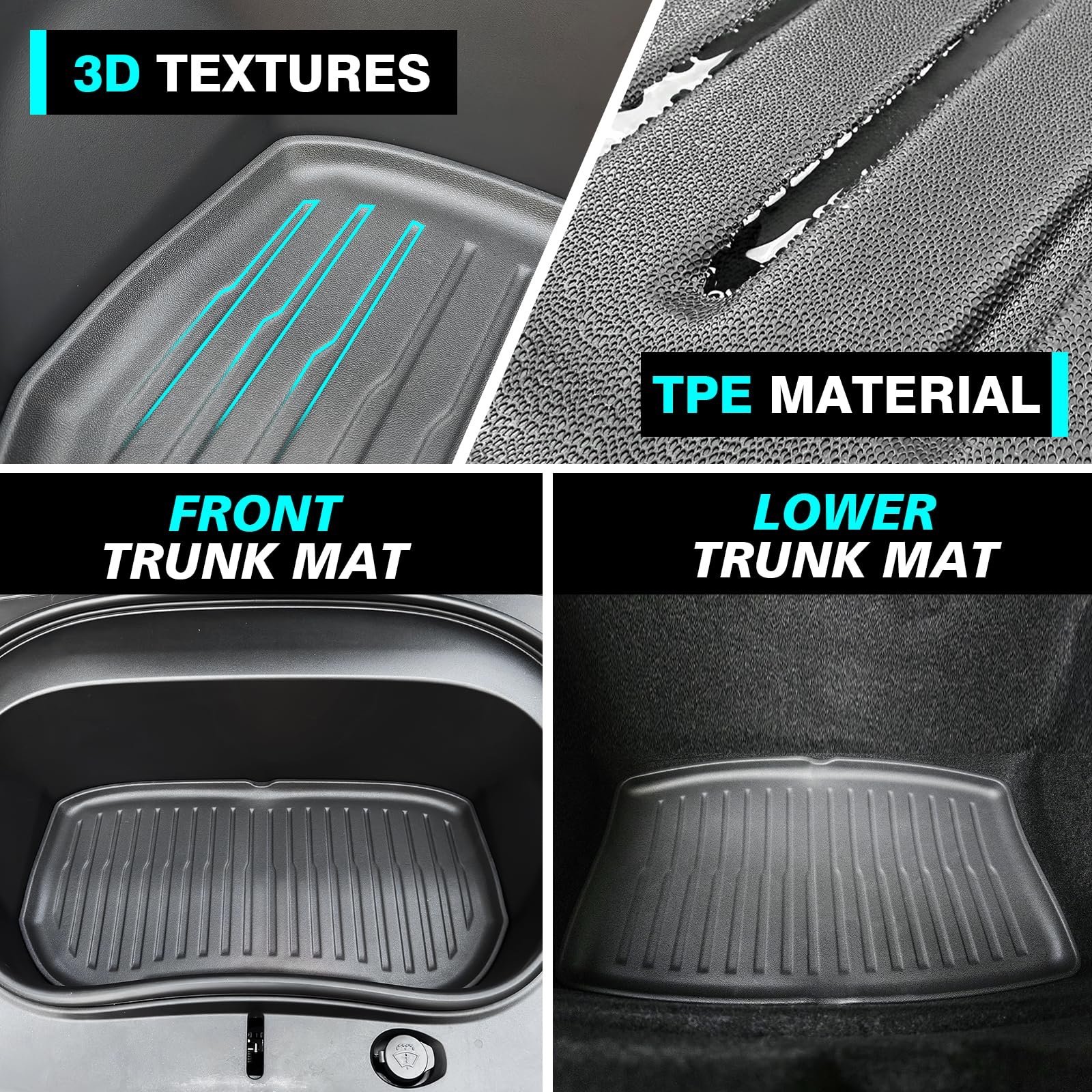 Function: Our floor mats are designed with Anti-Slip Bottom Rubber Nail to make sure the floor mats are perfectly secured and enhance driving safety, which becomes more important when the Model 3 Highland doesn’t has floor mat anchor. Upper+lower layer trunk mats and front trunk bed mat provides full protection to your trunk bed while preventing items from sliding around.