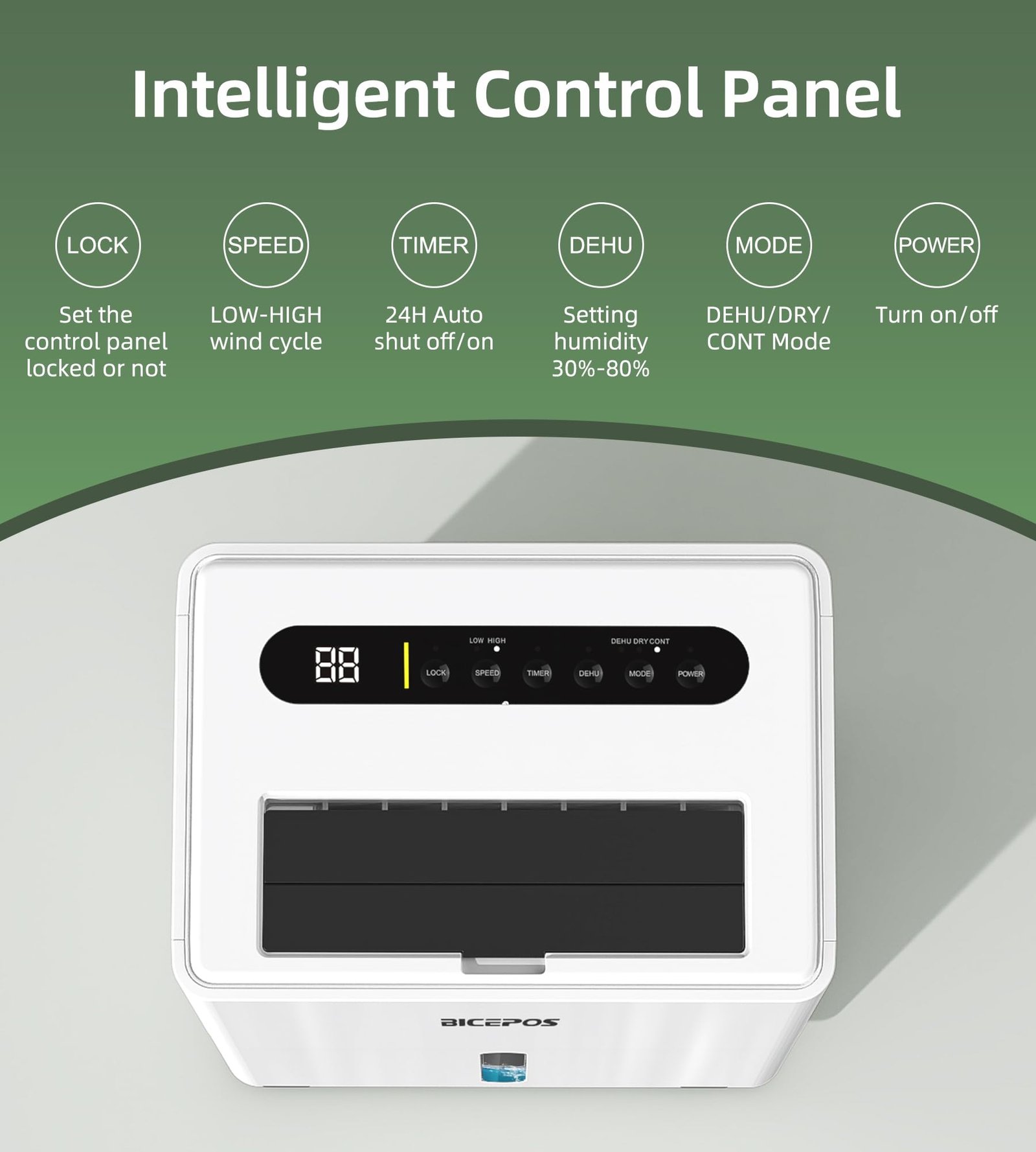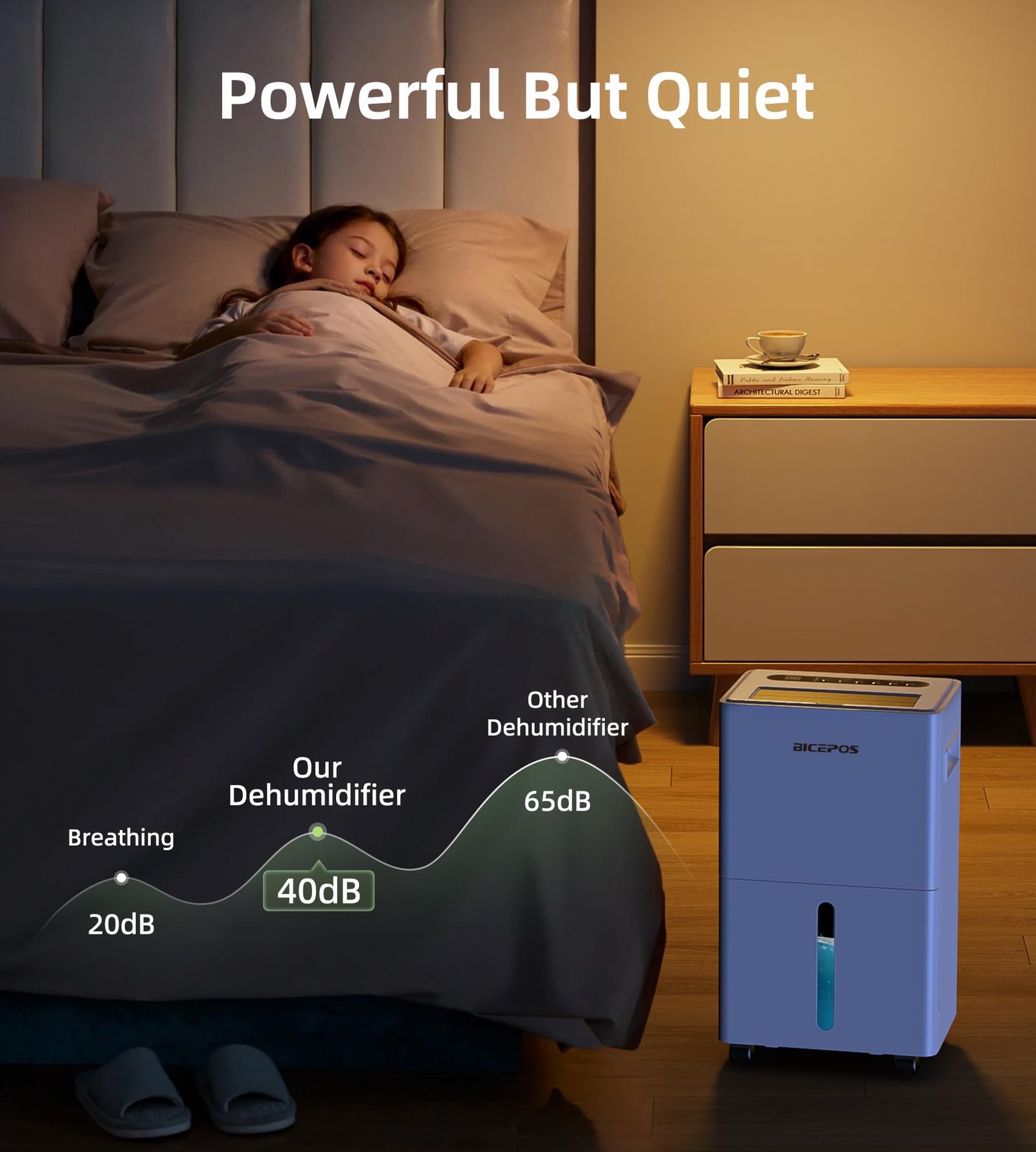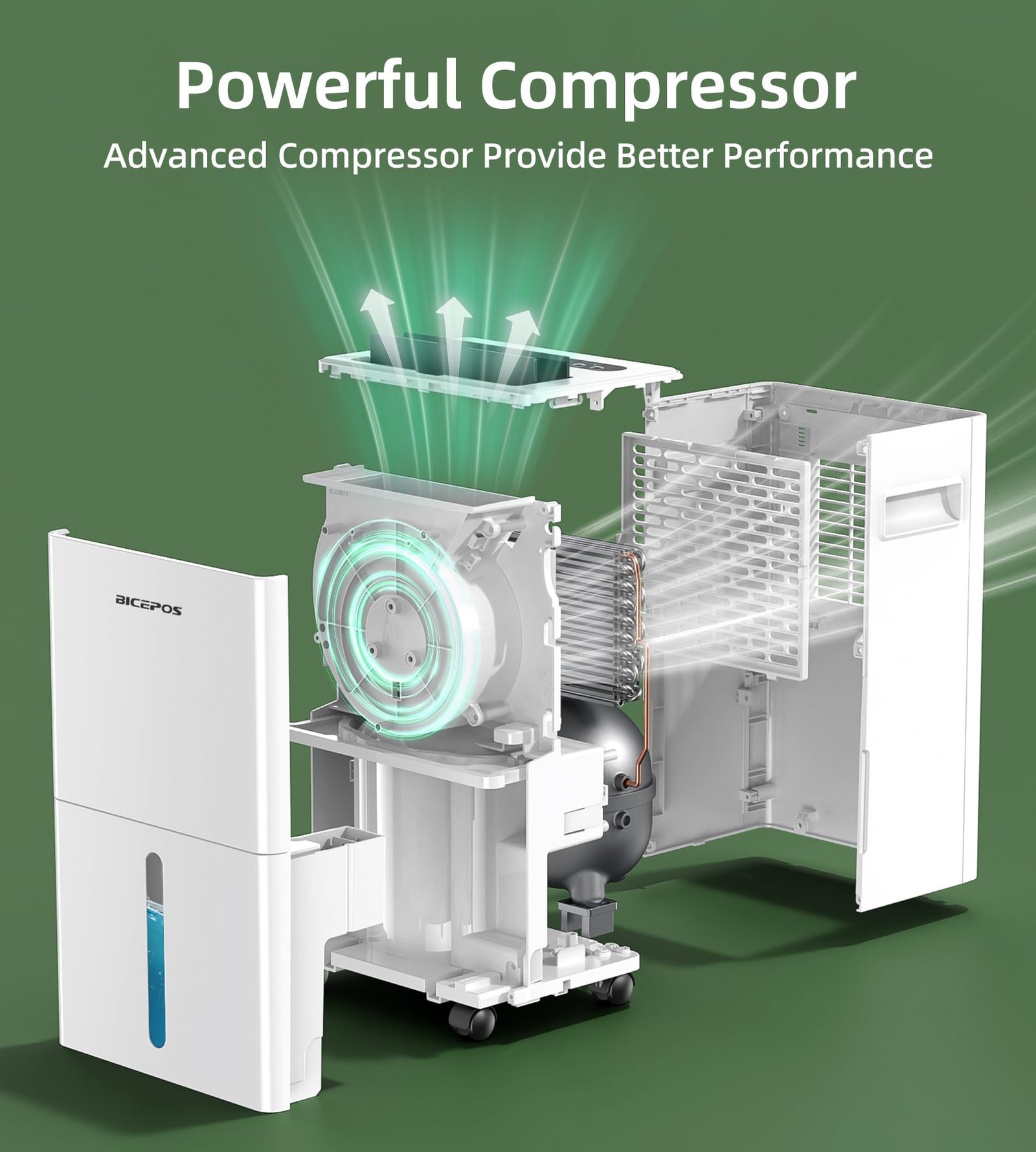Smart Dehumidifier Should Be Like This-The upgraded Bicepos basement dehumidifier utilizes advanced compressor technology, making it more compact yet highly efficient. It can remove up to 21 pints of moisture per day (at 95°F, 90% RH), making it perfect for spaces up to 1,500 sq. ft, including living rooms, basements, bedrooms, and offices. With an adjustable humidity range of 30% to 80%, it allows you to effortlessly maintain the ideal indoor humidity levels.