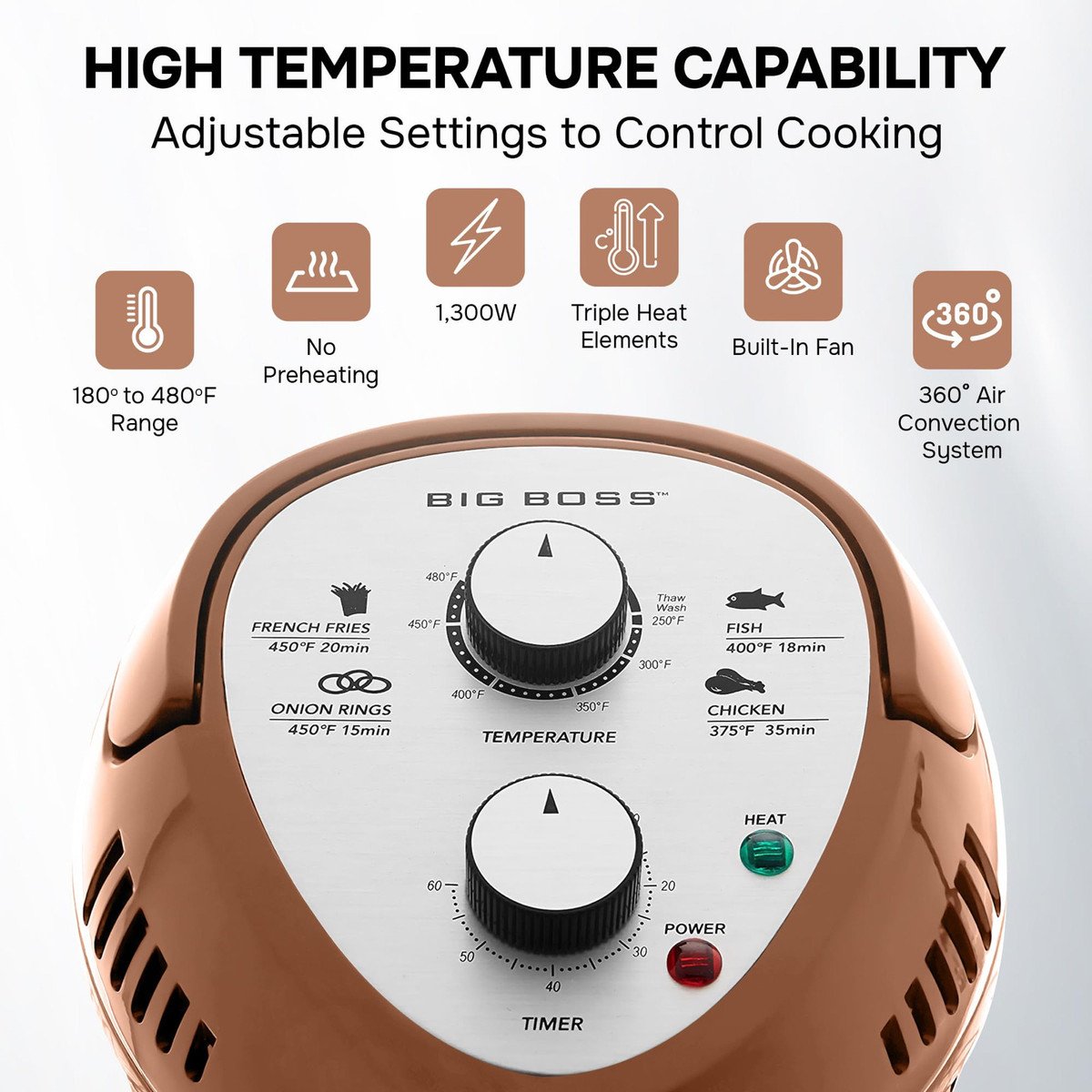 enjoy your favorite foods without the added calories! the big boss air fryer allows you to fry, bake, grill, & roast with little to no oil in this all in one countertop unit