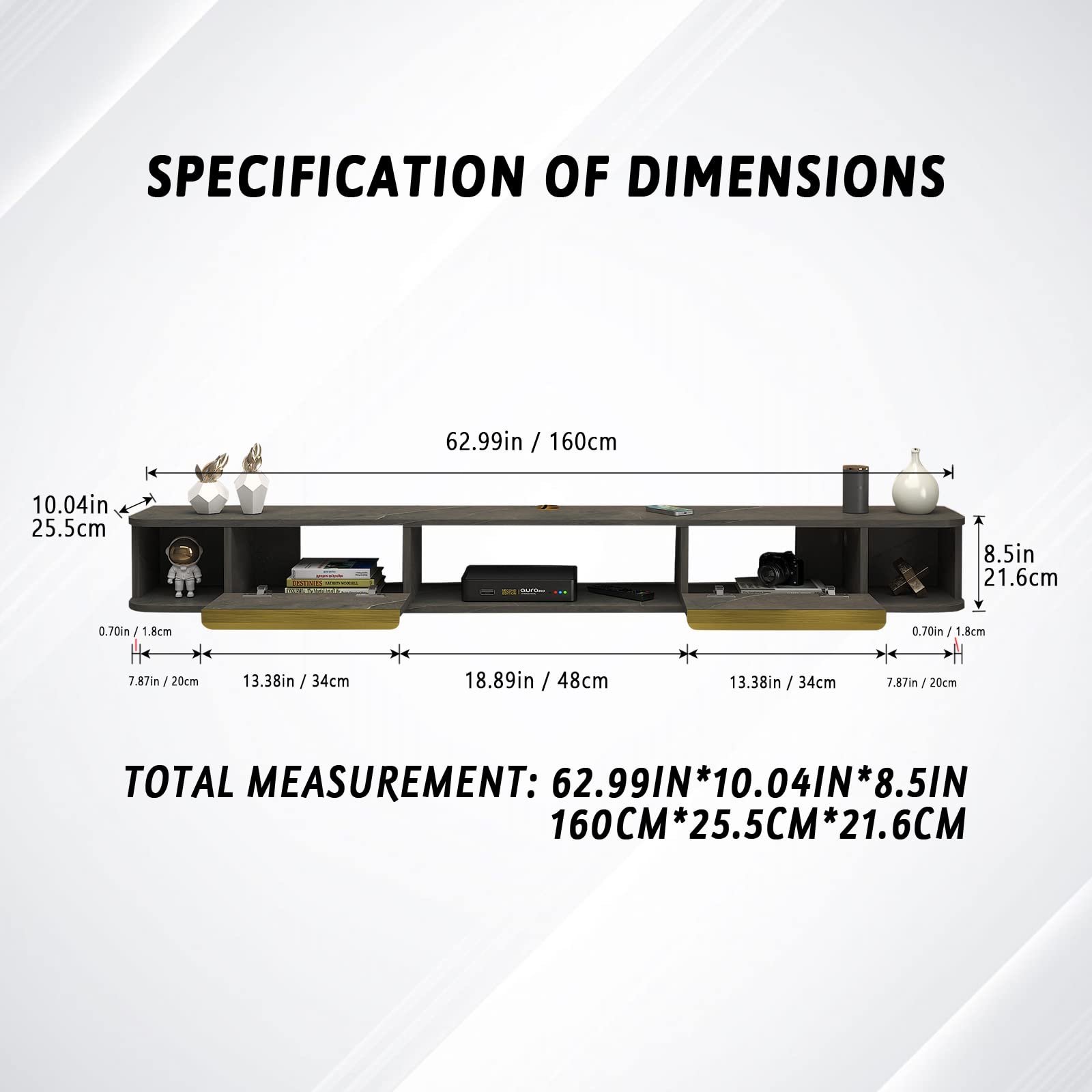 [Assembly & Service] Size: L62.99 x W10.04 x H8.5IN / Package: 1*TV Shelf+1*Screwdriver+ 1*Hardware Accessories Box+1*Spirit Level+1*Pair Gloves+1*Drill Bit+1*Instruction.