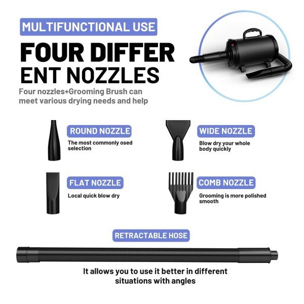 Perfect accessories and appearance: We are equipped with four nozzles in different shapes to meet all drying requirements. Ergonomic handle, easy to use. Small size, convenient for transportation and storage.At the same time, we also provide a pet bathing brush to make it convenient for you to bathe your honey pet.