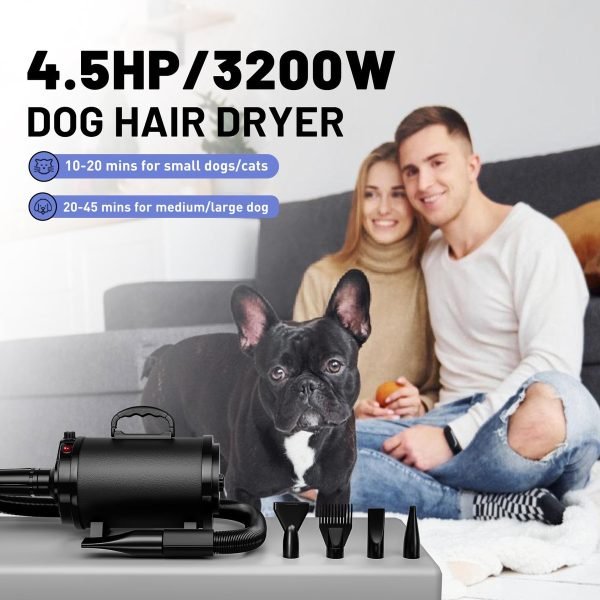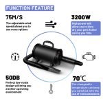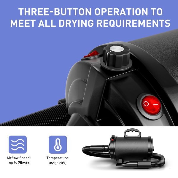 3800w stable output power: Dog hair dryer is equipped with an upgraded 3800w/5.2PS motor. It can continuously deliver strong performance. You can use the button to set the wind speed, and the speed range is 15-75m/s