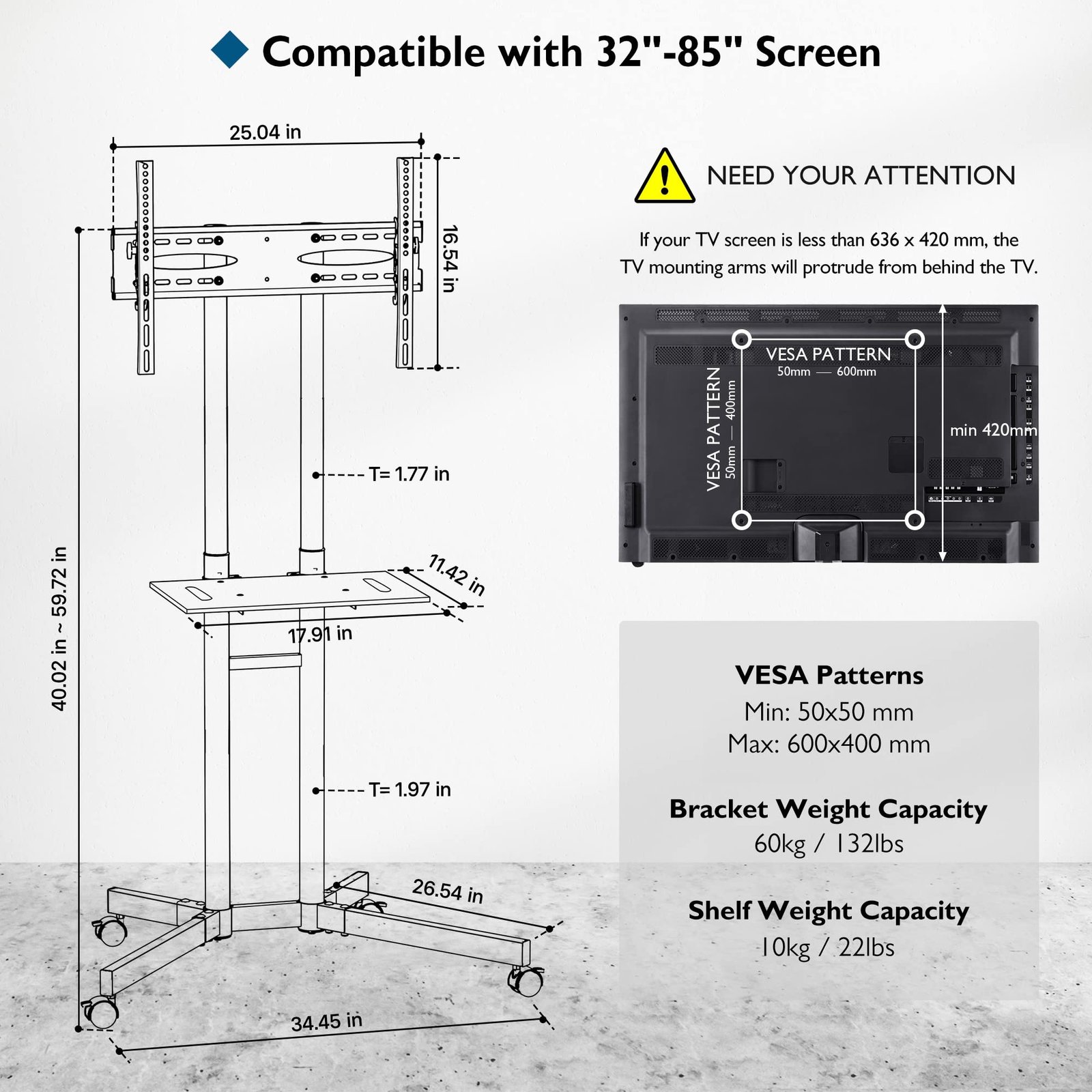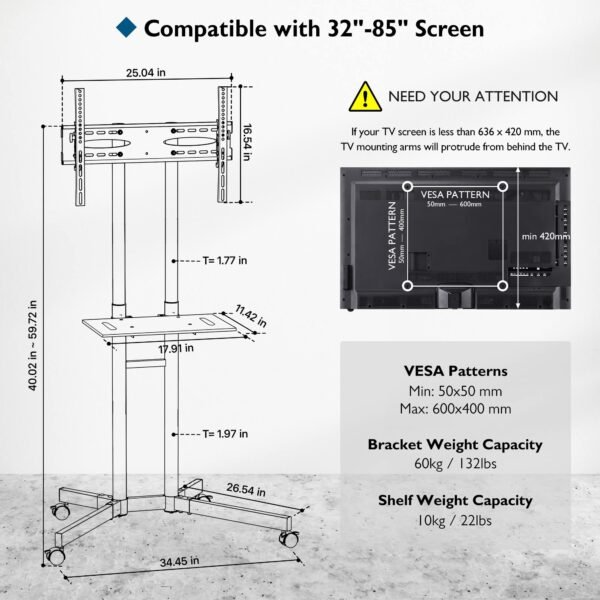 ✅ STURDY & DURABLE CONSTRUCTION WITH CABLE MANAGEMENT – Crafted from high-quality steel, this rolling TV stand supports up to 132lbs, offering stable support for your TV. The built-in cable management system helps keep wires neatly organized and out of sight, maintaining a clean, clutter-free look in your home or office