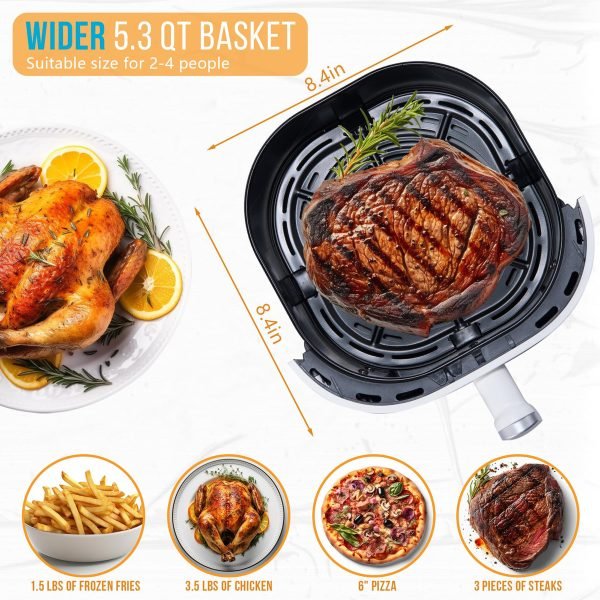 [Suitable Capacity]: This compact air fryer holds 5.3 quarts of cooking space, accommodating 1.5 pounds of french fries or a 6″ pizza. Ideal for 2-4 people. Countertop-friendly size and fresh outlook make it an excellent kitchen appliance for your family!