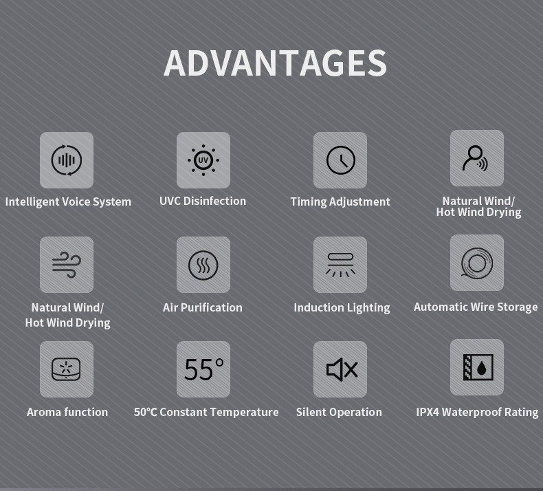 Function: UV disinfection, drying, air purification,natural wind, timing
