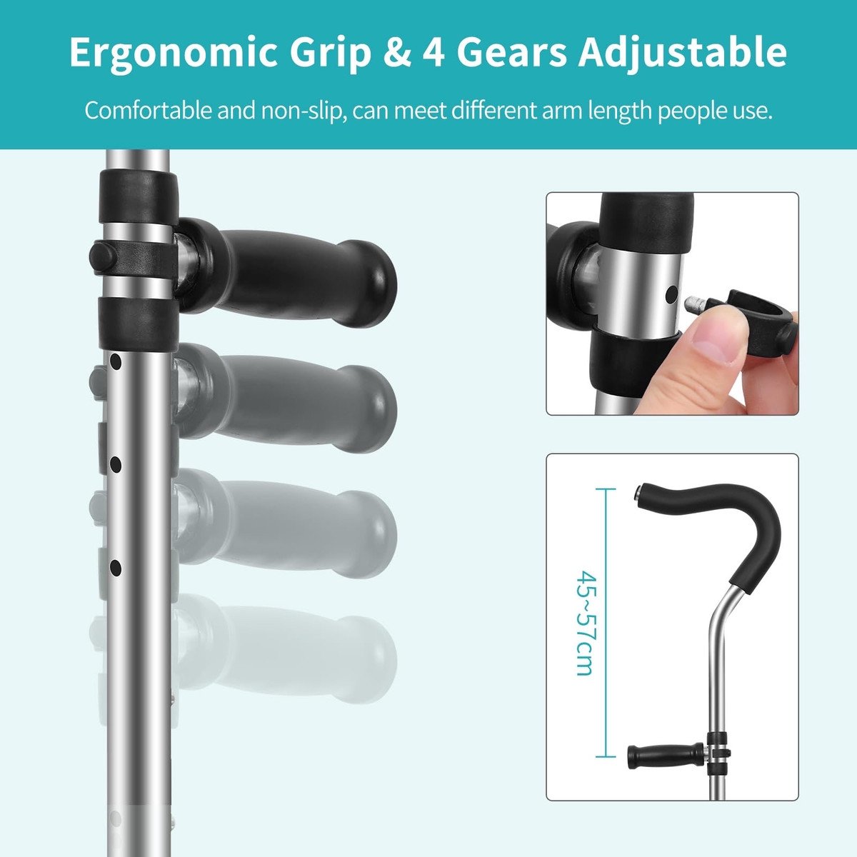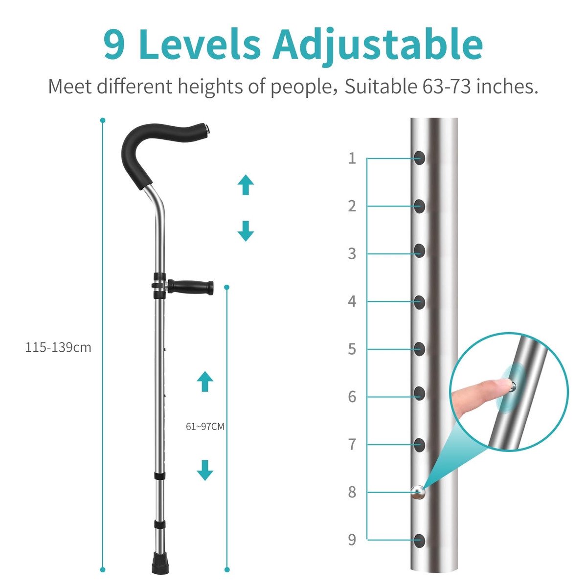 ? Height adjustable ? Ergonomically designed, with adjustable grip in 4th gear and adjustable leg in 9th gear, designed specifically for people between 63 and 73 inches tall, to help support the ankle, knee, and injured leg, and reduce the pressure on the injured area when walking.