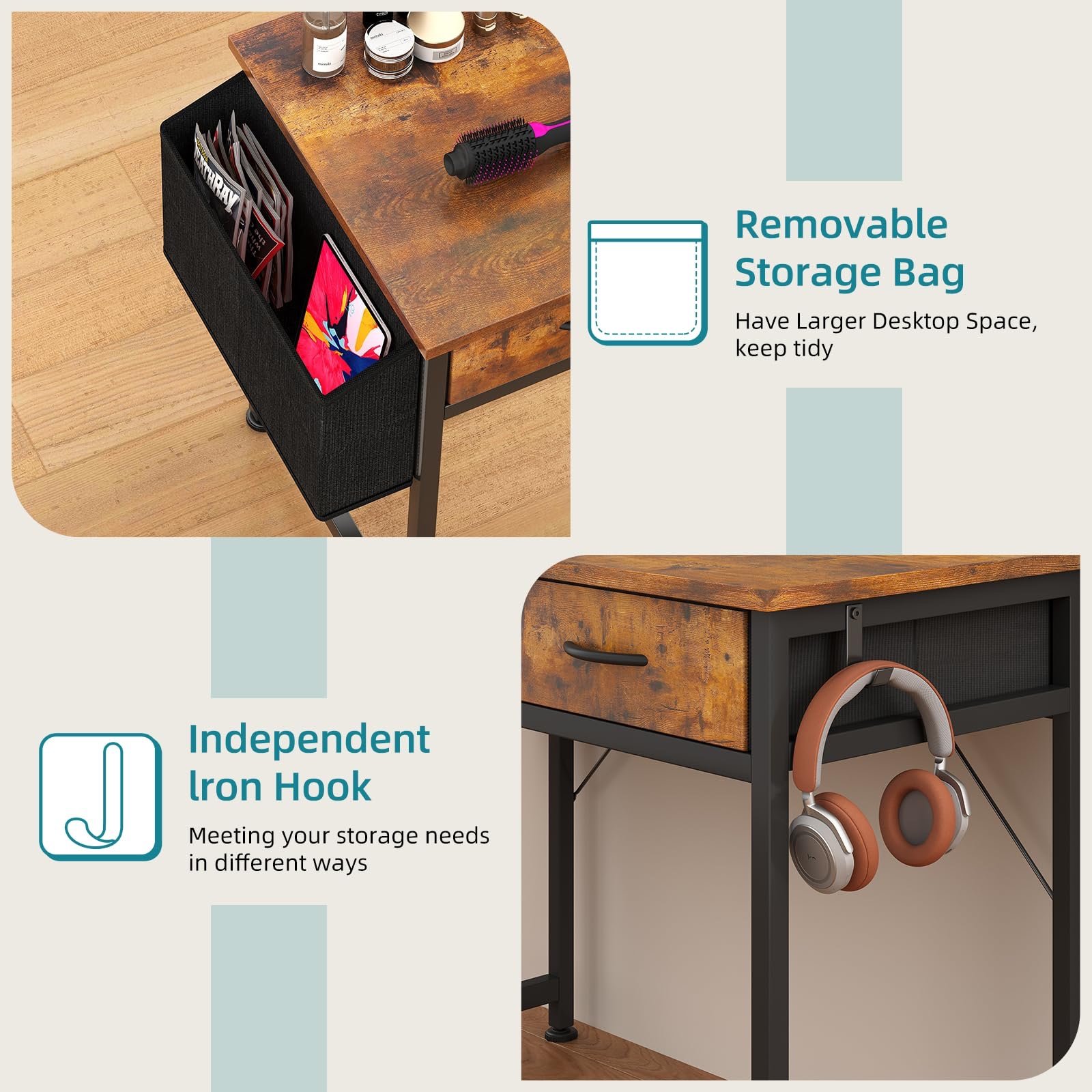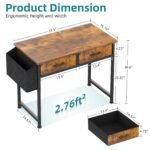 Modern simple vanity desk: 31”(L) * 15.7”(W) * 30.5”(H) size more suitable for small Bedroom. With out makeup mirror but have 2 fabric drawers used to storage your fine cosmetics. The storage bin on makeup desk left can organize storage for hair dryers, books and magazines.