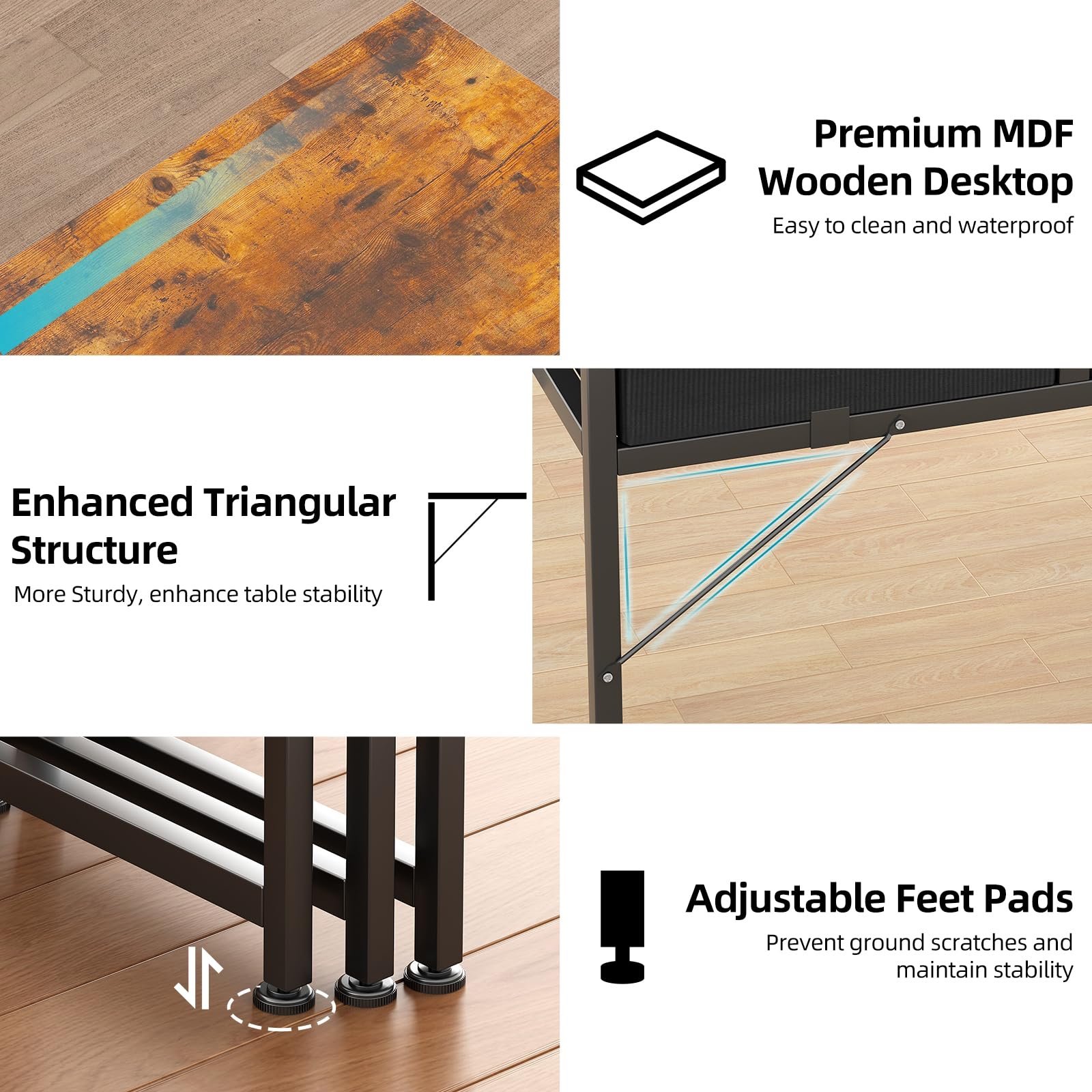 Wooden desktop and metal frame: This office desk is made of thick P2 particle wood board, scratch-resistant, waterproof and easy to clean. Table legs made of alloy steel with sandblasted surface to reduce odor. The connectors are made of stainless steel to solve the problem of easy rusting of screws.