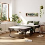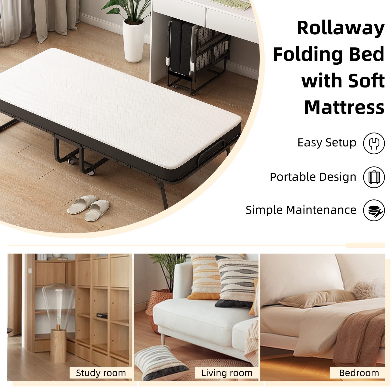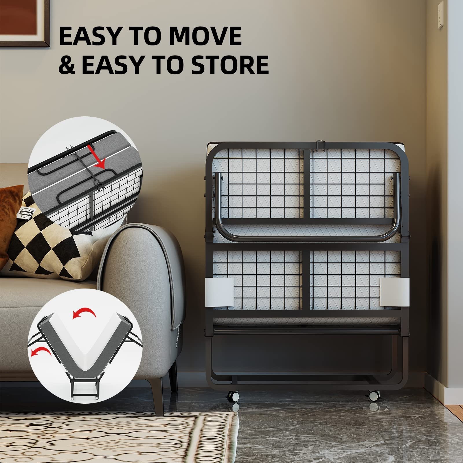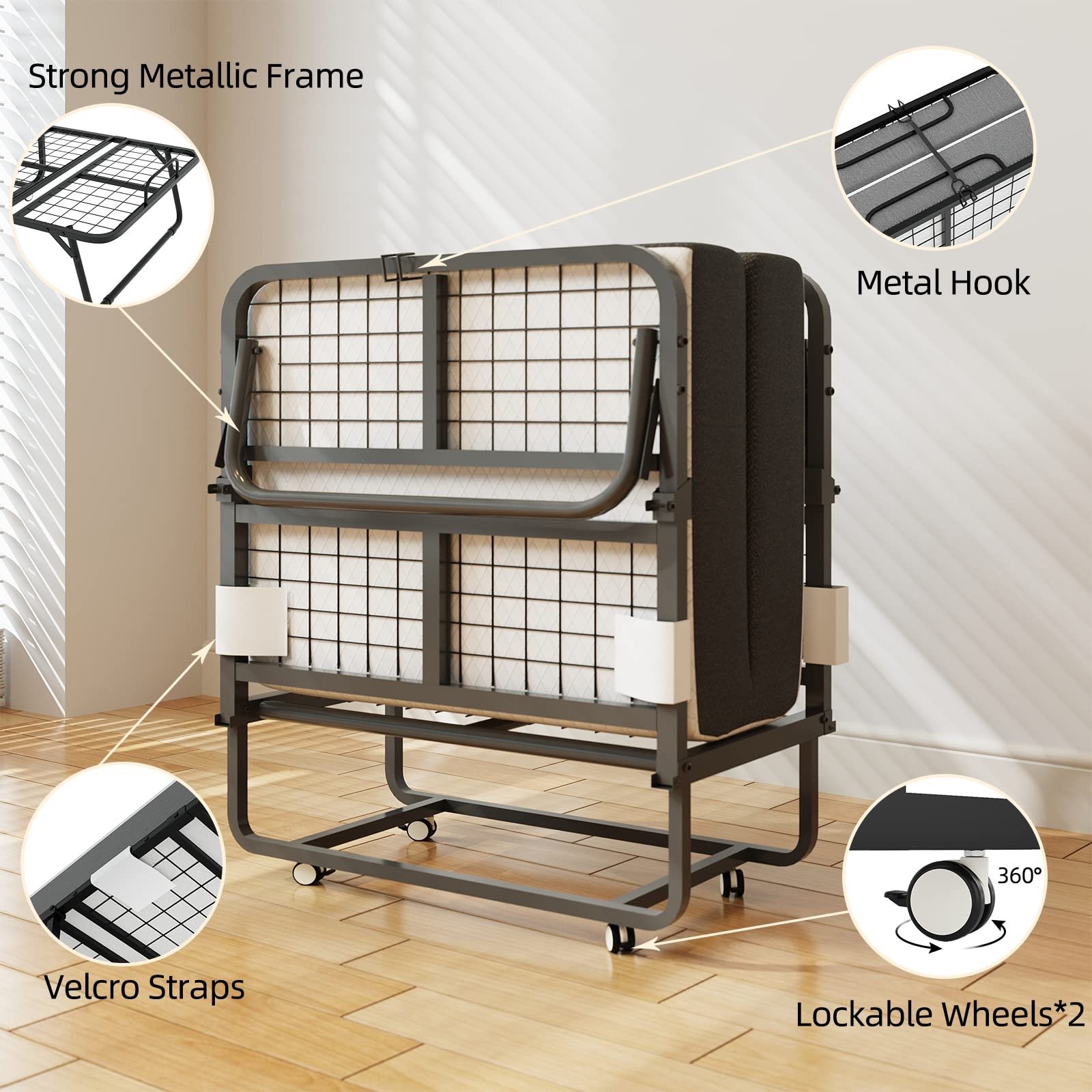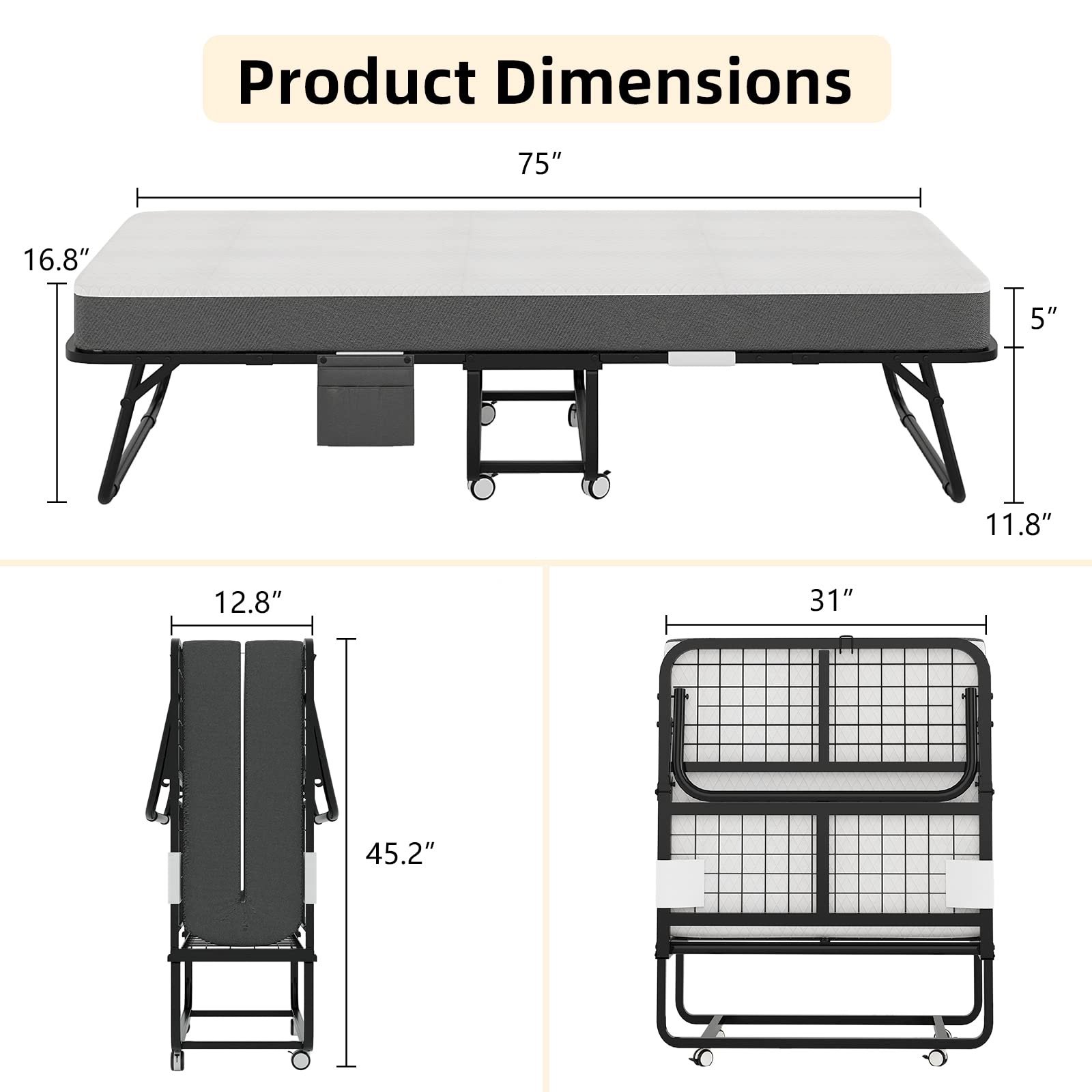 The folding bed includes a 5” mattress composed of 1.5” memory foam and 3.5” high-density base foam, providing balanced comfort and support for guests or everyday use.