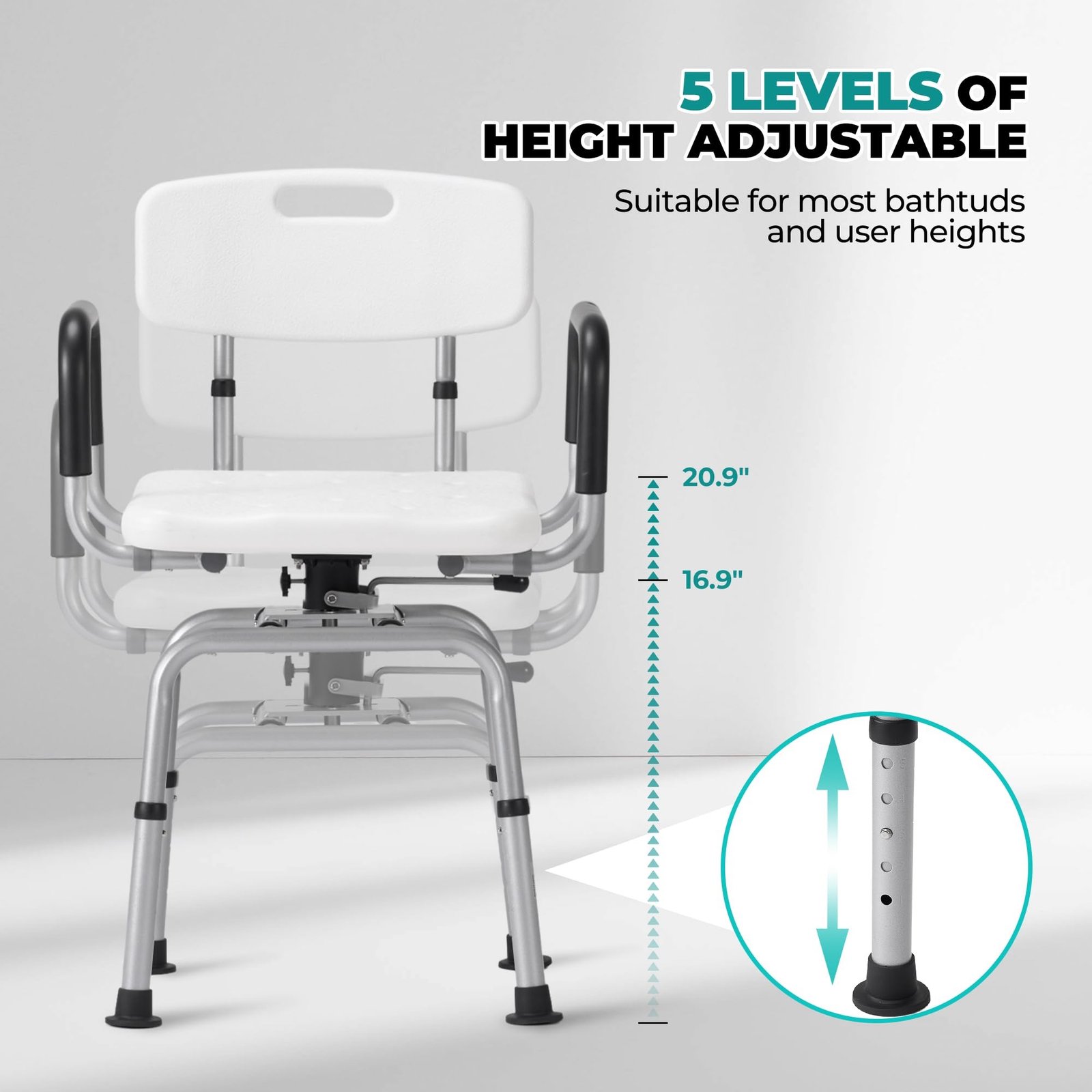 - 5 HEIGHT ADJUSTMENT: The shower chair is equipped with five levels of height adjustment function, one-button operation, easy to swivel the legs to the desired height, to meet the needs of different heights. The adjustable height not only enhances the comfort of use, but also effectively prevents slipping during the rotation process, which protects your shower safety.