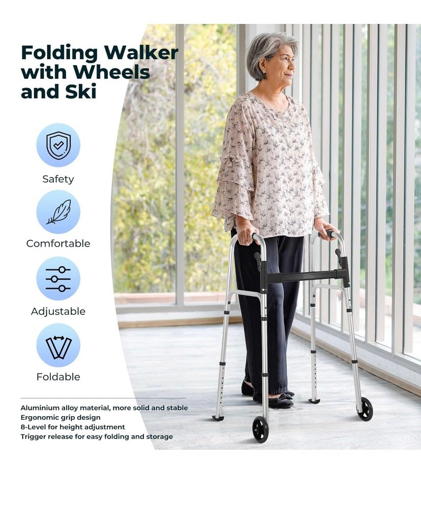 Smooth Maneuverability: Equipped with two skis glides and 5-inch front wheels, this lightweight folding walker glides effortlessly on various terrains, offering seniors smooth movement and enhanced stability both indoors and outdoors.