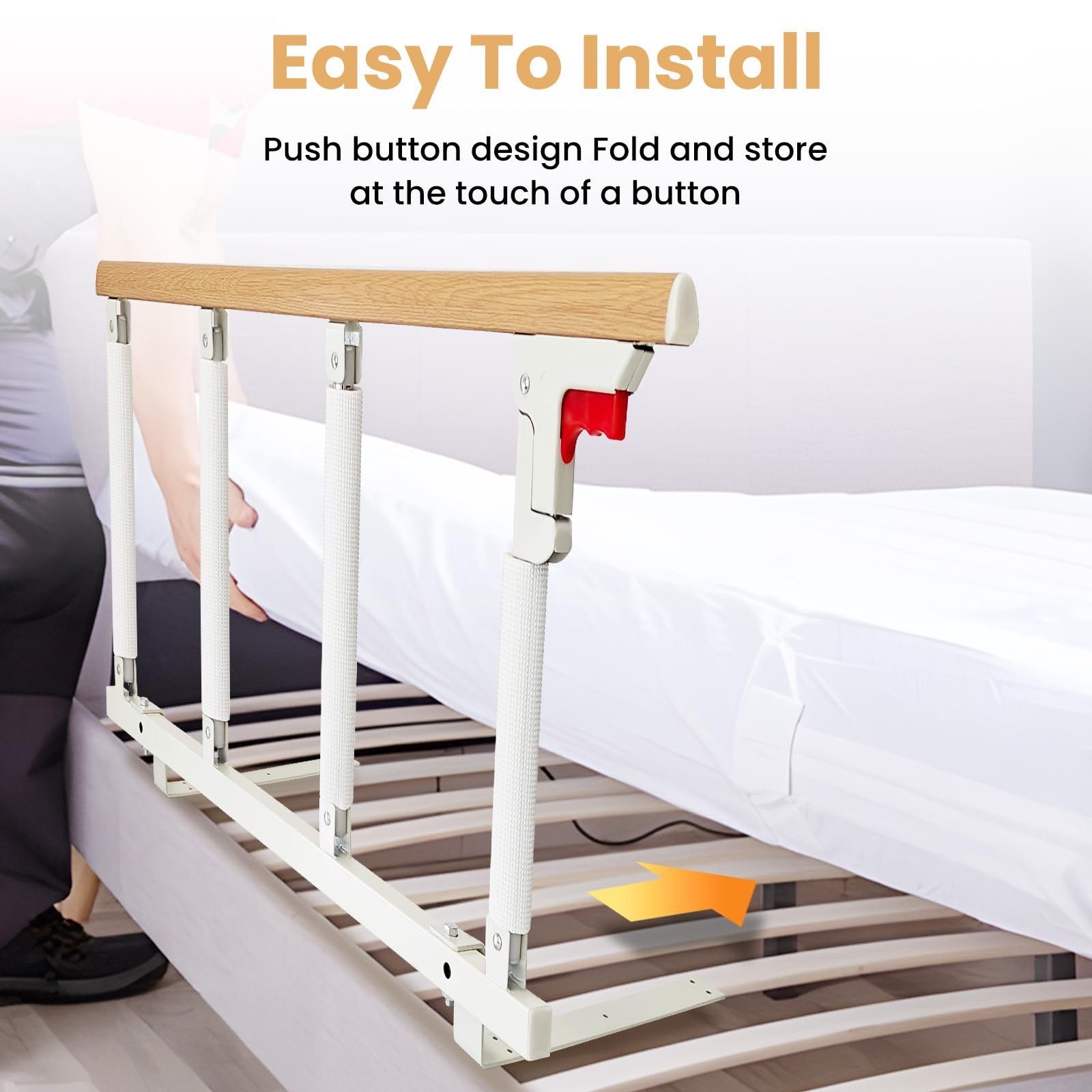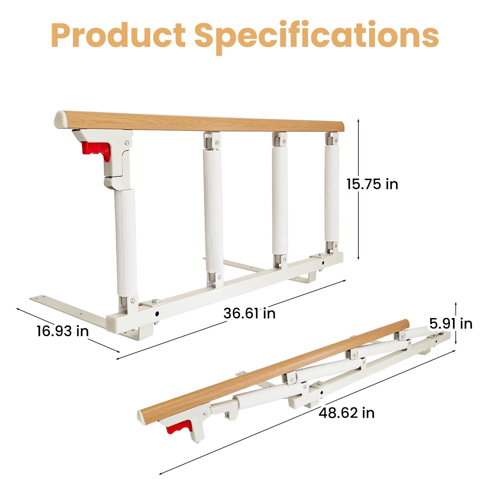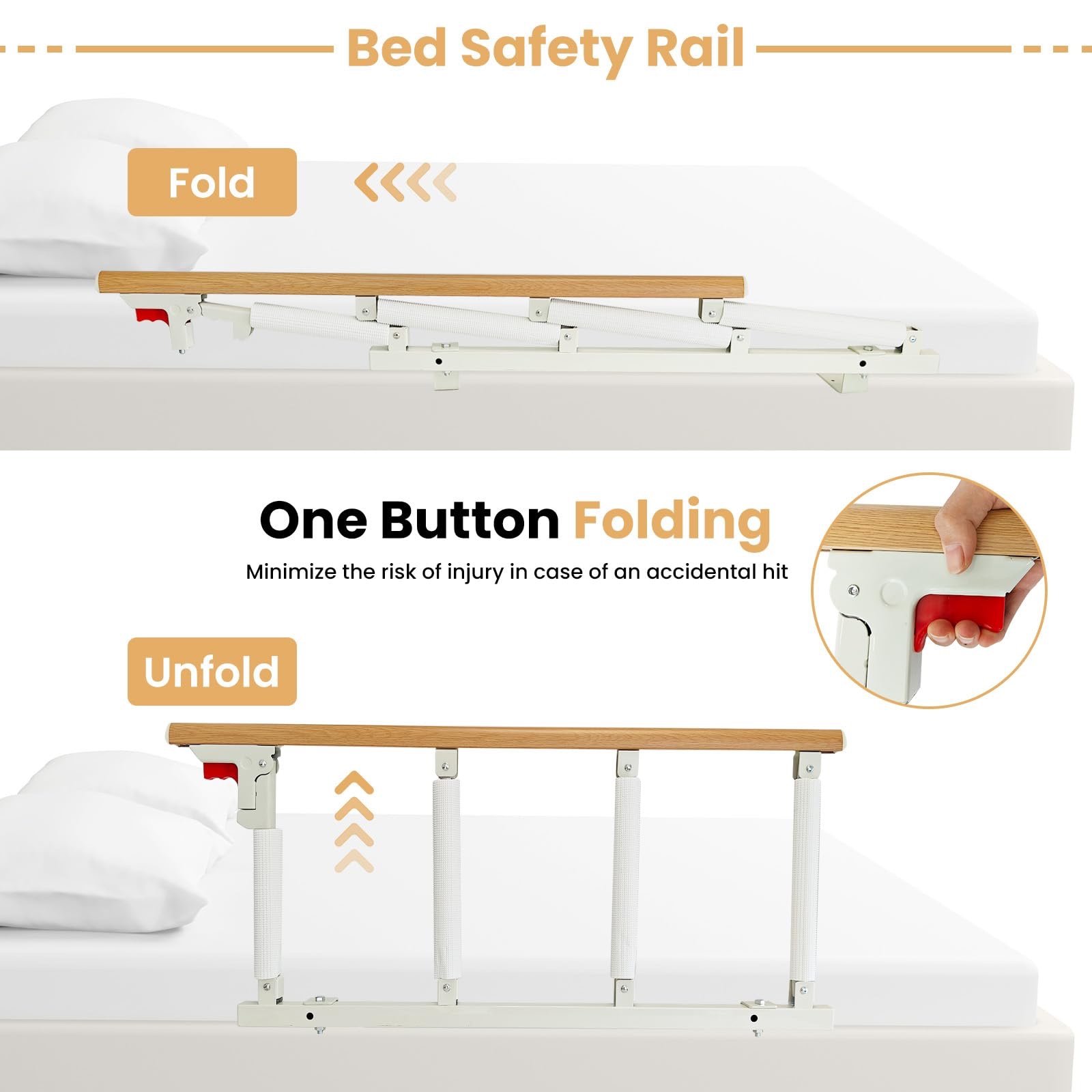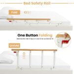Collapsible Guardrails:The 15.7” high bar rail is perfect for preventing users from rolling out of bed at night. When not in use, press the red button to swing the bed rails down and the non-slip foam provides better friction between the mattress and the box spring. This humanized design brings great convenience for getting in and off the bed