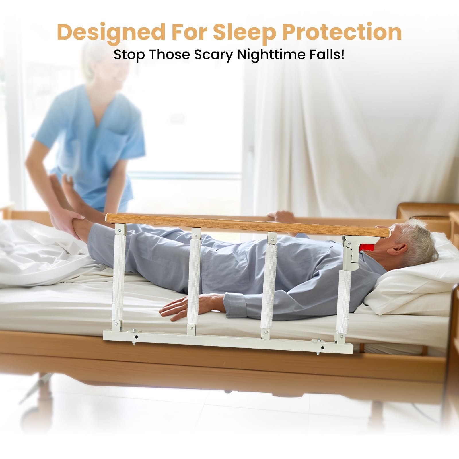 Considerate Design:The height and angle of the bedside guardrails are carefully designed to provide safety protection without compromising the user’s comfort. 36.6″ long and 15.7″ high bed handrail plays a protective and supportive role, provides a comfortable and secure grip for getting in and out of bed safely. And four stand-bars are equipped with sponge padding to minimize the risk of injury in case of an accidental hit