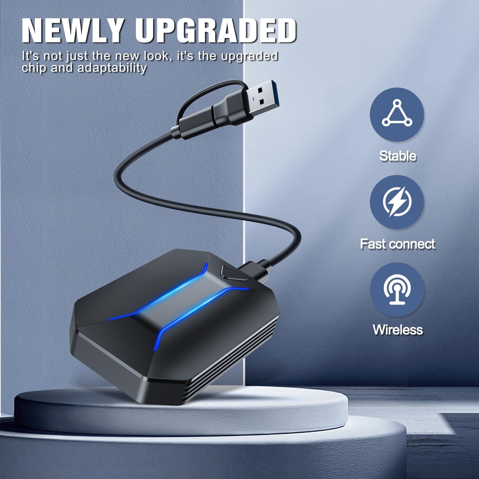 【Wide Compatibility】:Apple iPhone wireless adapter works with most factory wired CarPlay cars. Compatible with most models on the market. Features a dual-ended cable that gives you the flexibility to switch between USB and Type-C ports. To confirm if your car is compatible with our Apple CarPlay wireless adapter, please refer to the comparable models image at the bottom of the page