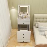 【Spacious & Classified Storage Space】: This dressing table features a deep storage area, removable 8-grid divider, and pull-out drawer. The stool also includes internal storage space and a practical drawer. With this 3-in-1 vanity set, you can easily organize your beauty items in an orderly manner.
