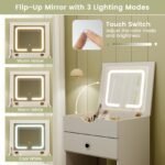 【Flip-up & Flexible Vanity Mirror】: This makeup vanity table boasts a versatile flip-up mirror with an adjustable position. The mirror can be effortlessly flipped using the convenient cut-out handle. Ensuring safety, the table features buffer hydraulic rods and premium metal hinges for smooth and slow operation.