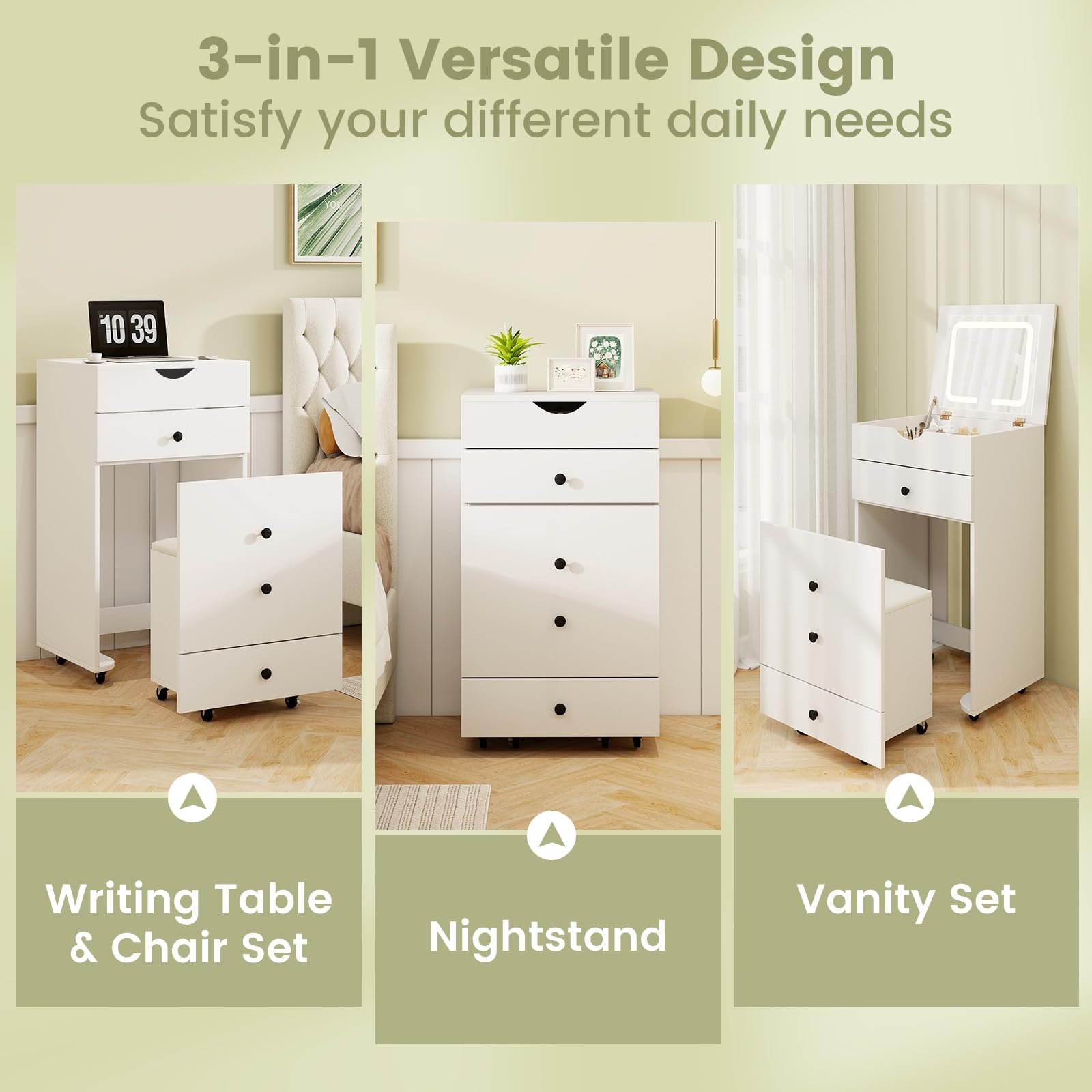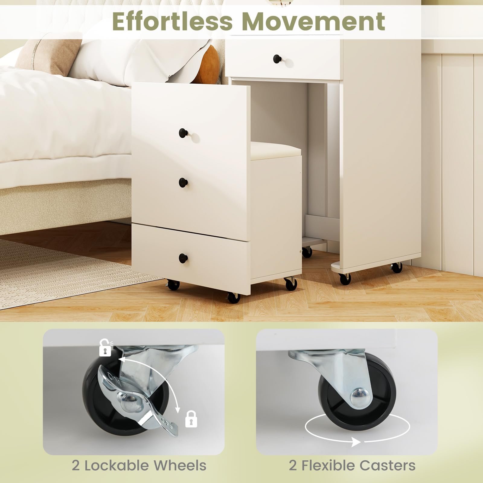 【Versatile & Space-saving】: This vanity set doubles as a writing table and chair set or nightstand, catering to your diverse needs. The stool can be conveniently tucked under the desk to save space. Equipped with universal casters, both the vanity desk and stool offer effortless movement.