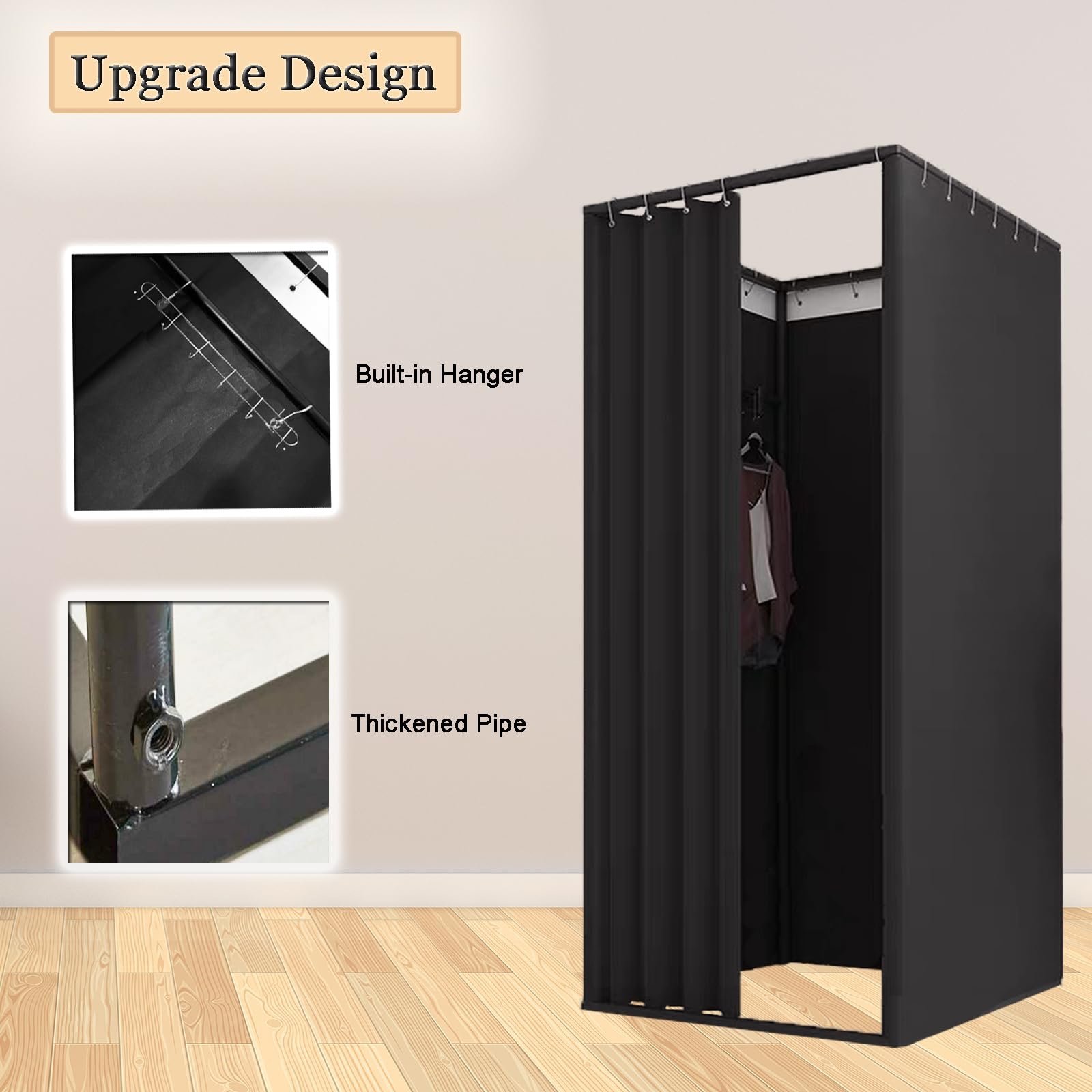Privacy Protector: Are you insecure when changing clothes. Don’t worry, the fitting room gives you enough security. Blackout curtains and thickened pipes create large privacy space for you at any time. Its enclosure dimensions are 42x10x7 inches