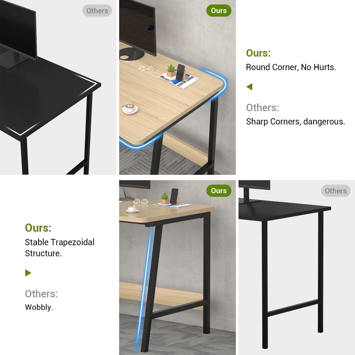 With Round desk Corner Edge. Our desk has safe round corners. Round corners to prevent bumps, no hurts and nor afraid of children getting hits. Spacious desktop provides ample space for a computer desk and organizing your books, plants, collections, knick-knacks and so on