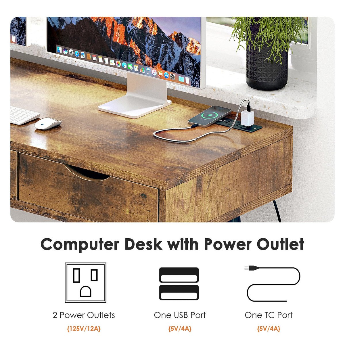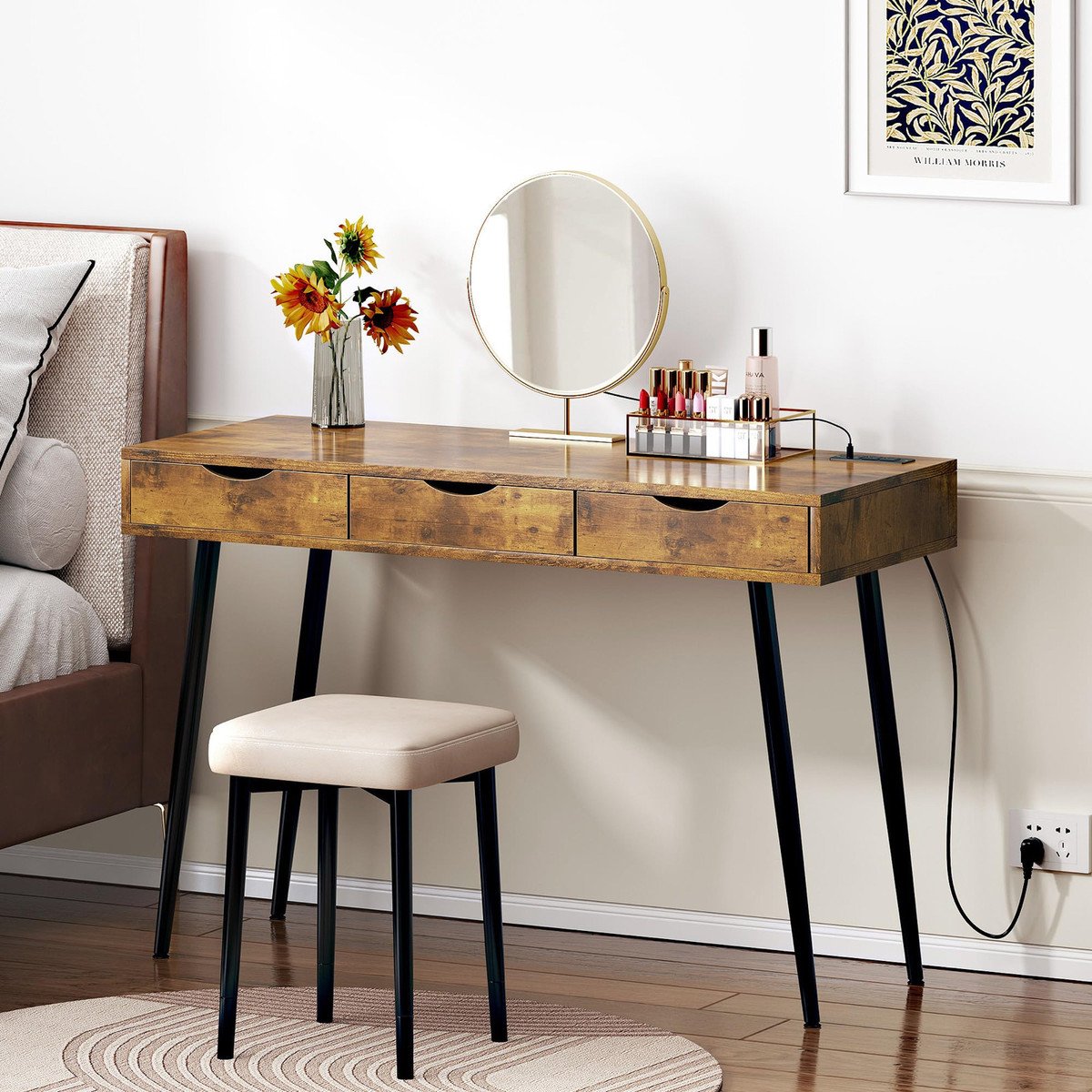 ?Vanity Deskwith Power Outlet?Equipped with two power sockets, a USB and TC interface, you can charge your computer, mobile phone, and iPad at any time. The convenient and practical design will make you no longer anxious about low battery.(pls note that the stool is not included)