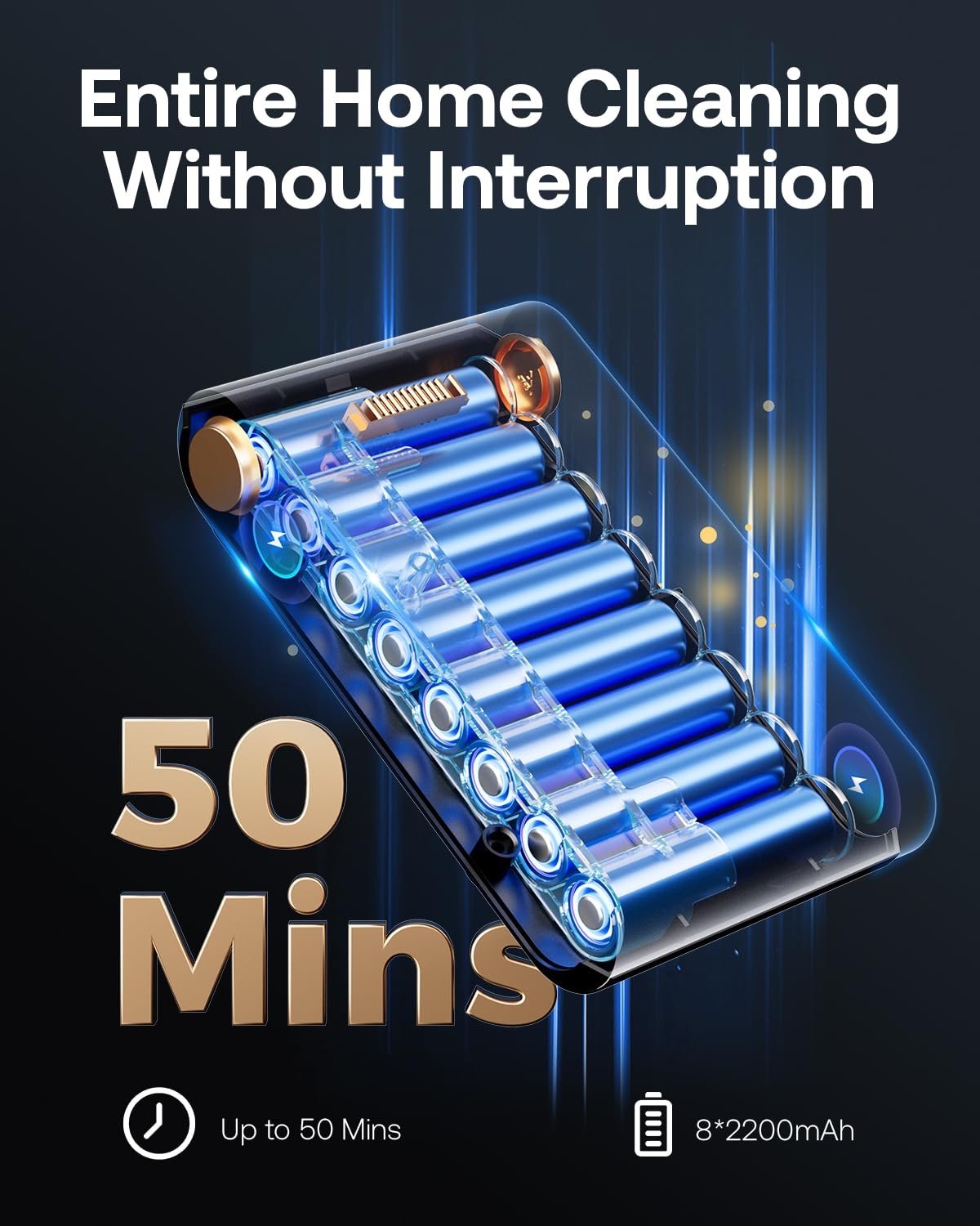 【Detachable Batteries & Long Runtime】The self-standing vacuum cleaner is equipped with 8 batteries and can run for 50 minutes max. One charge suffices to clean the whole house without interruption. The detachable batteries are convenient for easy replacement and charging